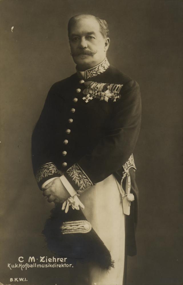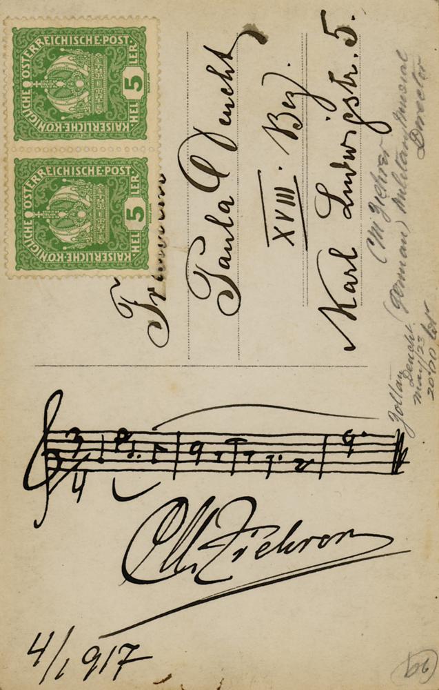 Austrian composer (1843-1922) who was one of the fiercest rivals of the Strauss family. Vintage matte-finish 3.5 x 5.25 postcard photo of Ziehrer in a three-quarter-length pose, boldly signed on the reverse in fountain pen, "C. M. Ziehrer," with the addition of a handwritten musical quotation. In fine condition.