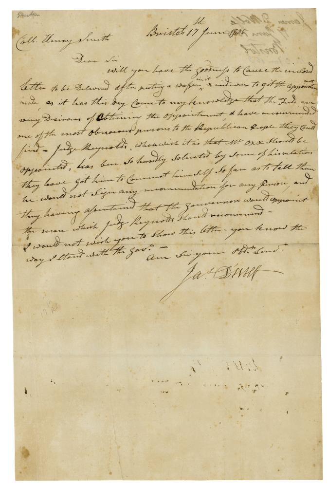 Slave trader, privateer, industrialist, and politician (1764-1837) who was said to be the second-richest person in the entire United States at the time of his death. His fortune was built upon the slave trade, coffee and sugar plantations in Cuba, privateering (his ship 'Yankee' captured 40 British vessels worth more than $5 million during the War of 1812), and New England textile mills. ALS signed “Jas. D'Wolf,” one page, 9.5 x 14.25, June 17, 1805. Handwritten letter to "Colo. Henry Smith," who would succeed Arthur Fenner as governor of Rhode Island in October, regarding a contentious political appointment. In part: "It has this day come to my knowledge that the Feds are very desirous of obtaining the appointment & have recommended one of the most obnoxious persons to the Republican people they could find—Judge Reynolds?has been so hardly solicited by some of his relations they have got him to commit himself so far as to tell them he would not sign any recommendation for any person, and they having ascertained that the governor would appoint the man which Judge Reynolds should recommend. I would not wish you to show this letter, you know the way I stand with the Gov'r." In fine condition, with light overall wrinkling.