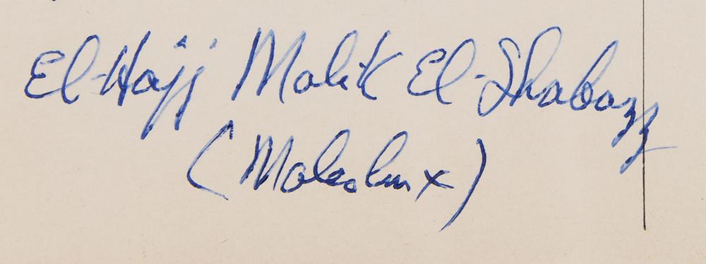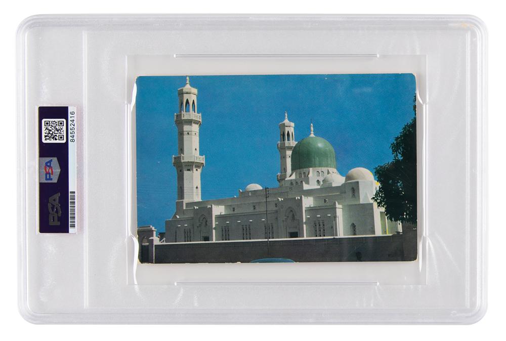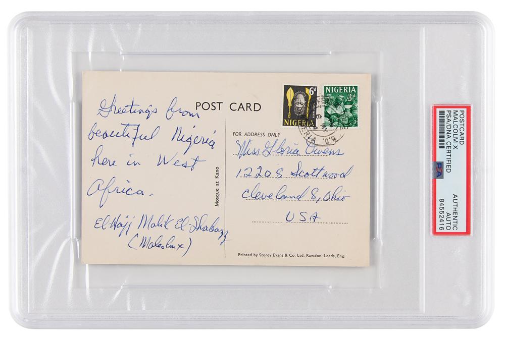 Rare postcard signed “El-Hajj Malik el-Shabazz (Malcolm X),” one page on a 6 x 4 color postcard depicting Nigeria’s Great Mosque of Kano, postmarked at University College on May 8, 1964. Short handwritten note to "Miss Gloria Owens, 12208 Scottwood, Cleveland 8, Ohio, USA." In full: "Greetings from beautiful Nigeria here in West Africa." Gloria Owens was the sister of Maceo X Owens, secretary at Muhammad's Mosque No. 7 in Harlem where Malcolm X preached alongside Louis Farrakhan. In fine condition. Encapsulated in a PSA/DNA authentication holder.