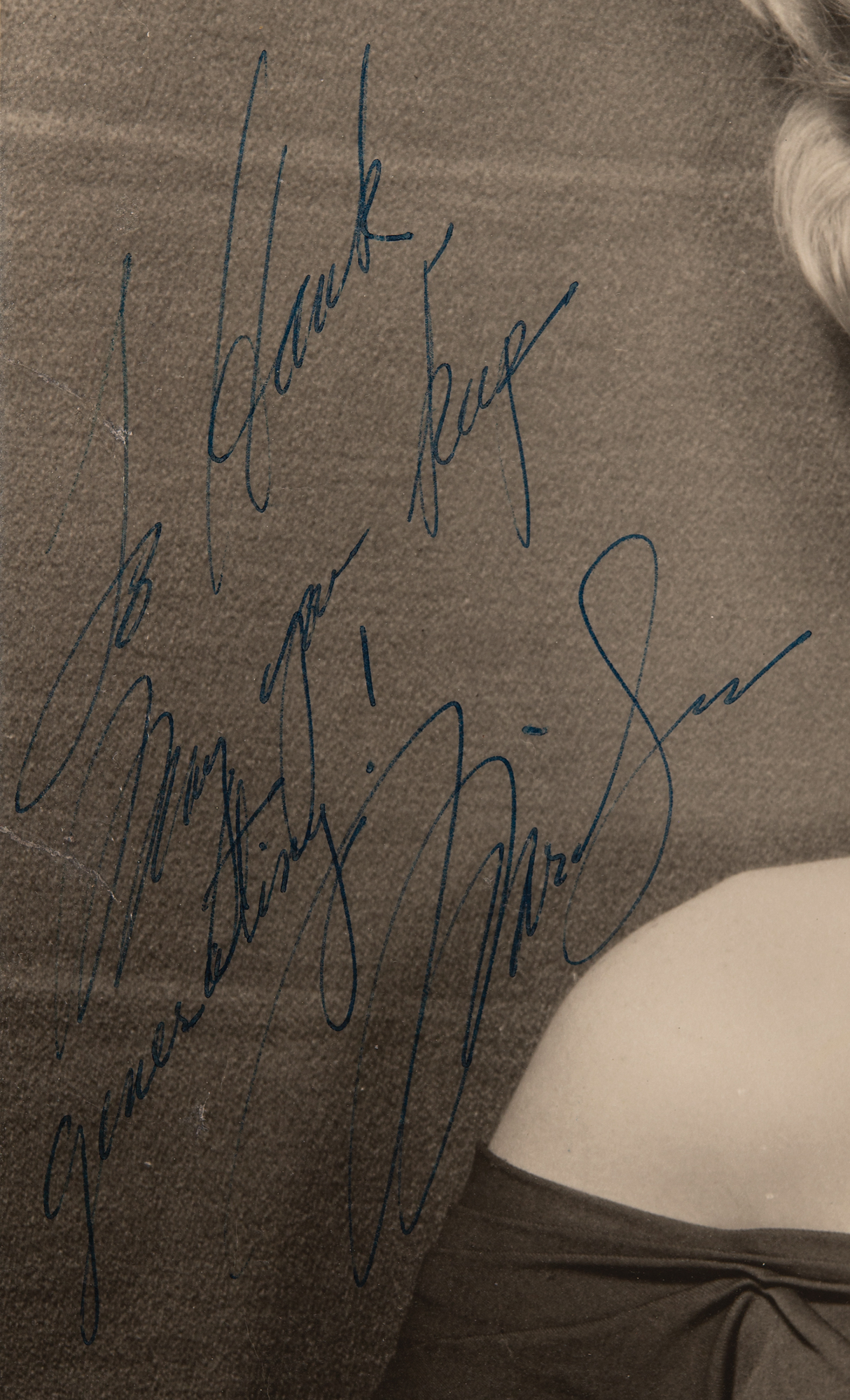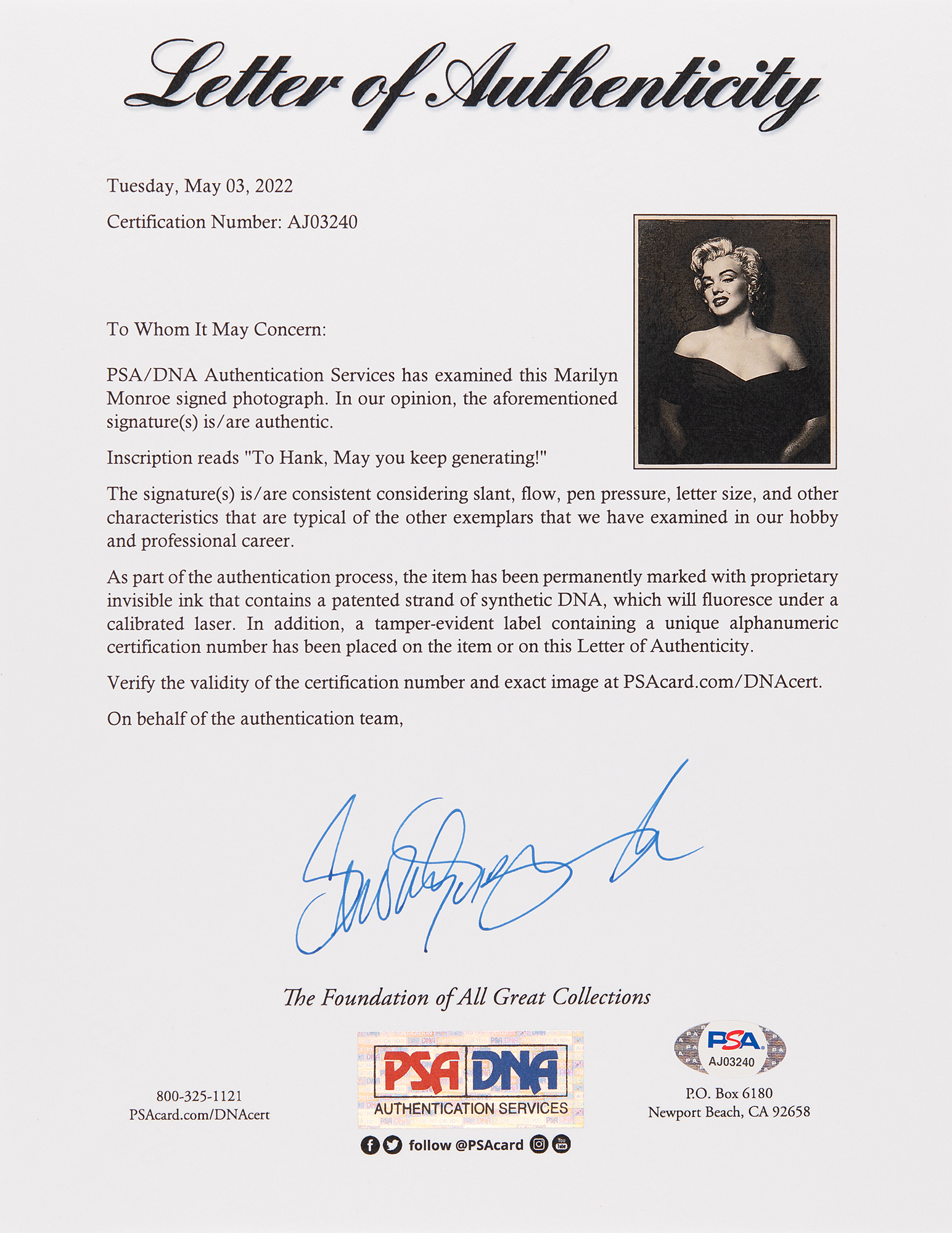 Vintage matte-finish 11 x 14 half-length portrait of Monroe taken in 1952 by Frank Powolny during a 20th Century Fox promotional shoot, signed and inscribed in blue ballpoint, “To Hank, May you keep generating, Marilyn.” The photo has been professionally restored, mainly along a horizontal fold to the lower portion of the image. In very good to fine condition, with a small tear to the top edge, light creasing, and aforementioned restoration. Accompanied by a full letter of authenticity from PSA/DNA.