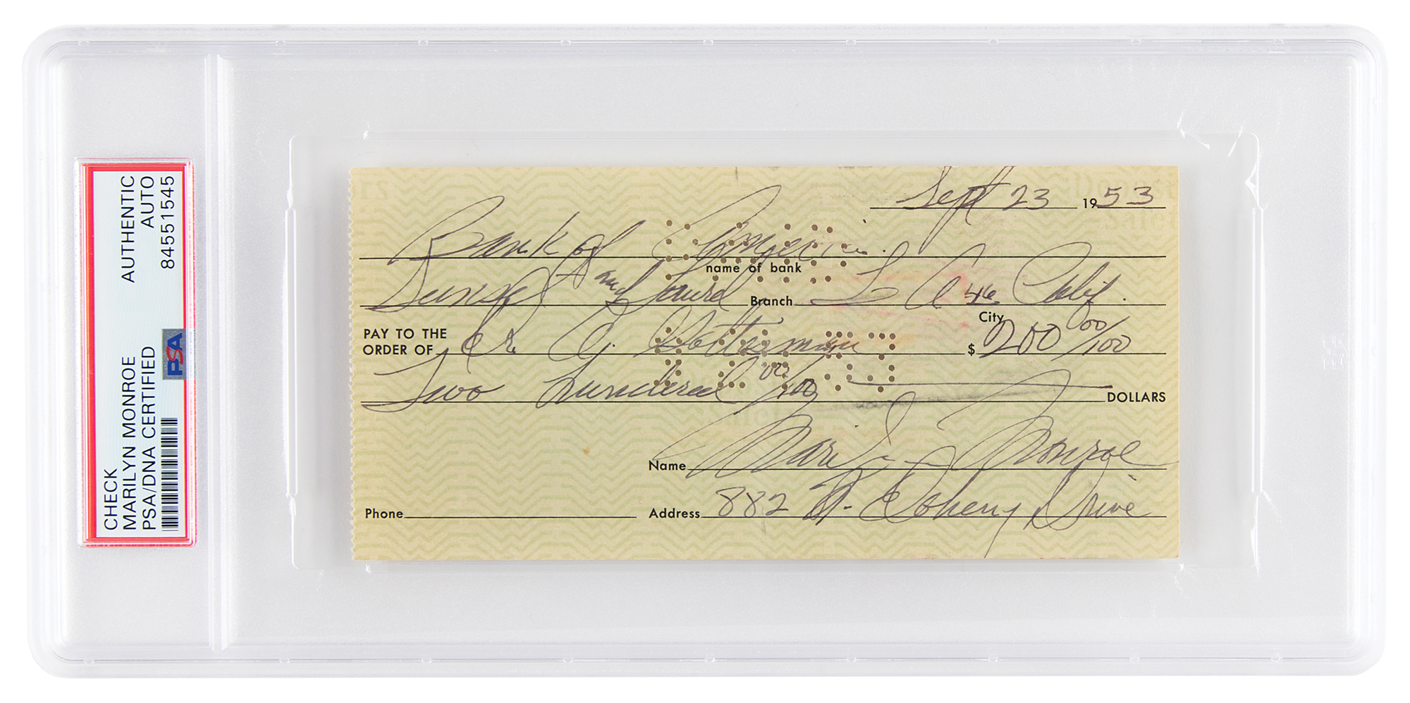 Bank check, 5.75 x 2.75, filled out and signed by Marilyn Monroe, payable to psychoanalyst Dr. Abraham Gottesman for $200, September 23, 1953. Below her signature, Monroe adds her address, "882 N. Doheny Drive." In fine condition. Encapsulated in a PSA/DNA authentication holder.