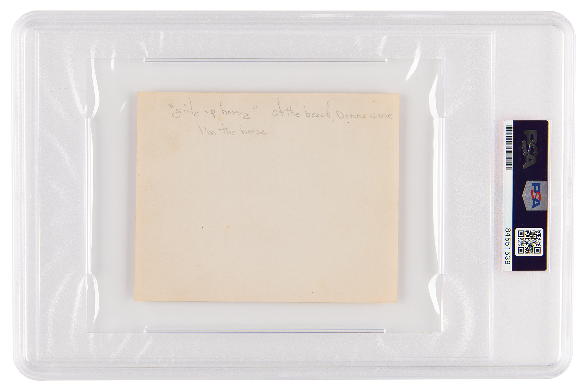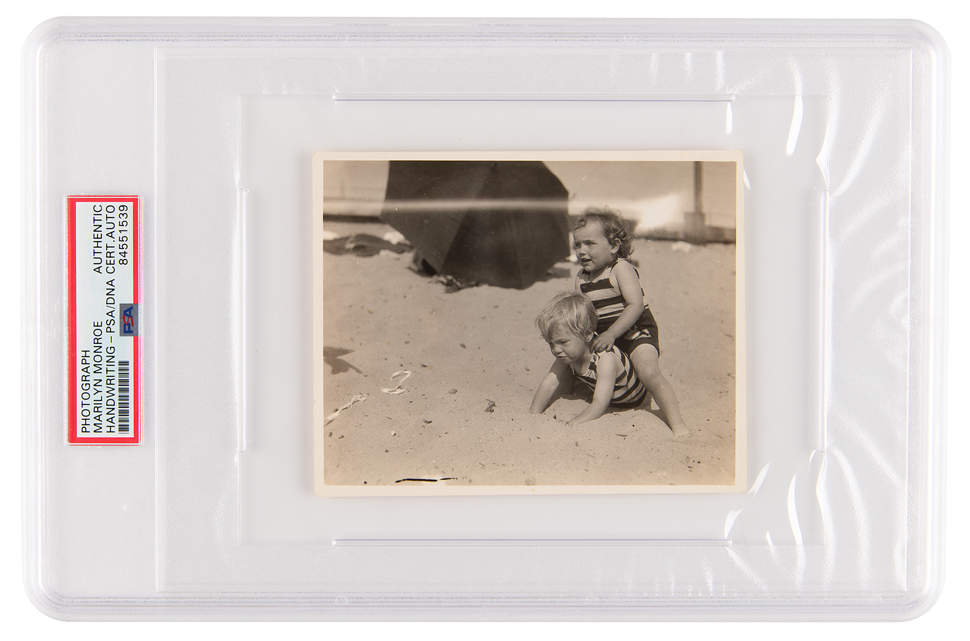 Original glossy 4.75 x 3.75 candid photo from circa 1928, showing Norma Jeane as a toddler at the beach, with her cousin Ida Mae pictured sitting on her back; the reverse of the photo is annotated in pencil in Monroe's teenage hand: “'gidy up horsy,’ at the beach, Donna & me, I’m the horse.” The child who Monroe identifies as “Donna” has been attributed in various other photos as the daughter of Olive and Marion Monroe, the latter being the brother of Gladys Pearl Baker, Marilyn's birth mother; whether “Donna” is a nickname or middle name for Ida Mae remains unknown. In fine condition, with scattered light creasing. Encapsulated in a PSA/DNA authentication holder.
