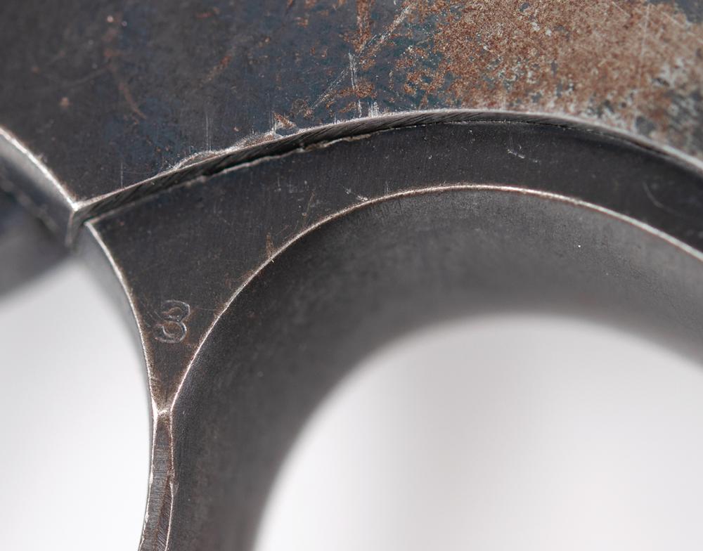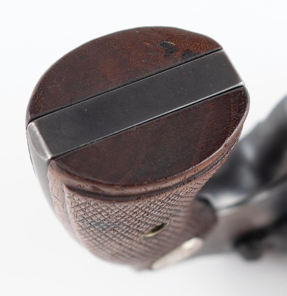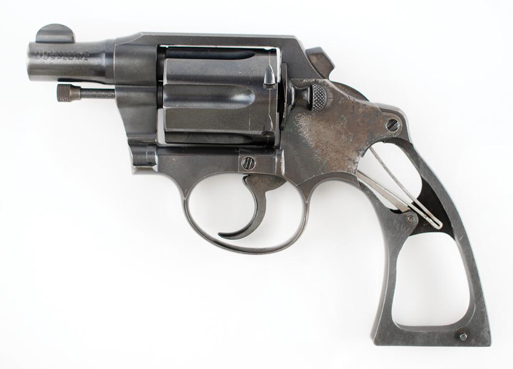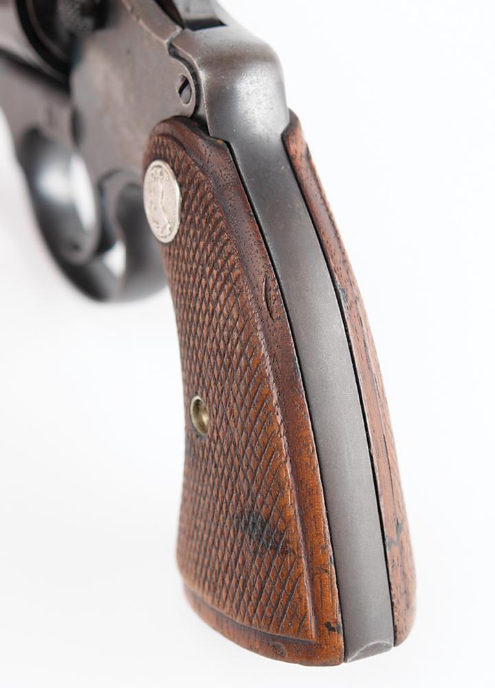 The revolver features much of its original finish, with some staining and wear to the stocks. It shows wear commensurate with a 93-year-old revolver which was likely carried in overcoat and suit pockets; the 'bobbed hammer' made it easier to conceal and less likely to catch on clothing in a quick-draw situation. The serial number is found in two places on the inside of the revolver: along the grip strap and on the reverse of the side plate. The side plate does show thinning and browning of the finish. The hammer is bobbed and the cut surface is dulled. The action is tight and the revolver really only shows exterior wear. This gun was not very old when it was recovered at the crime scene in a trail of blood and then thrust into a criminal investigation which yielded no suspects.