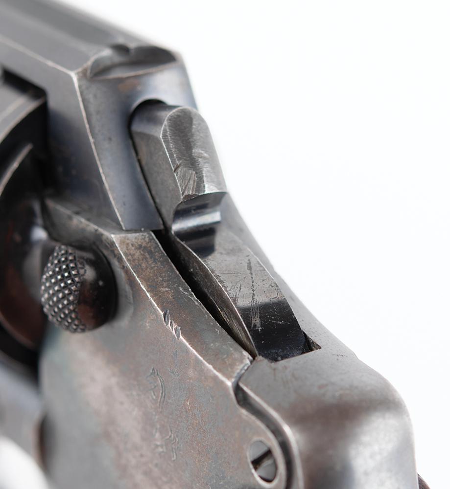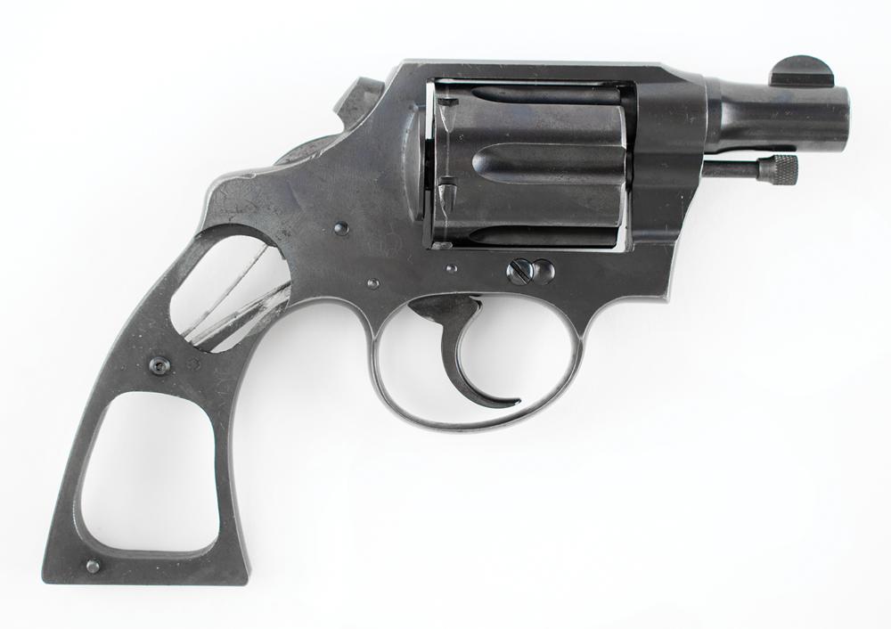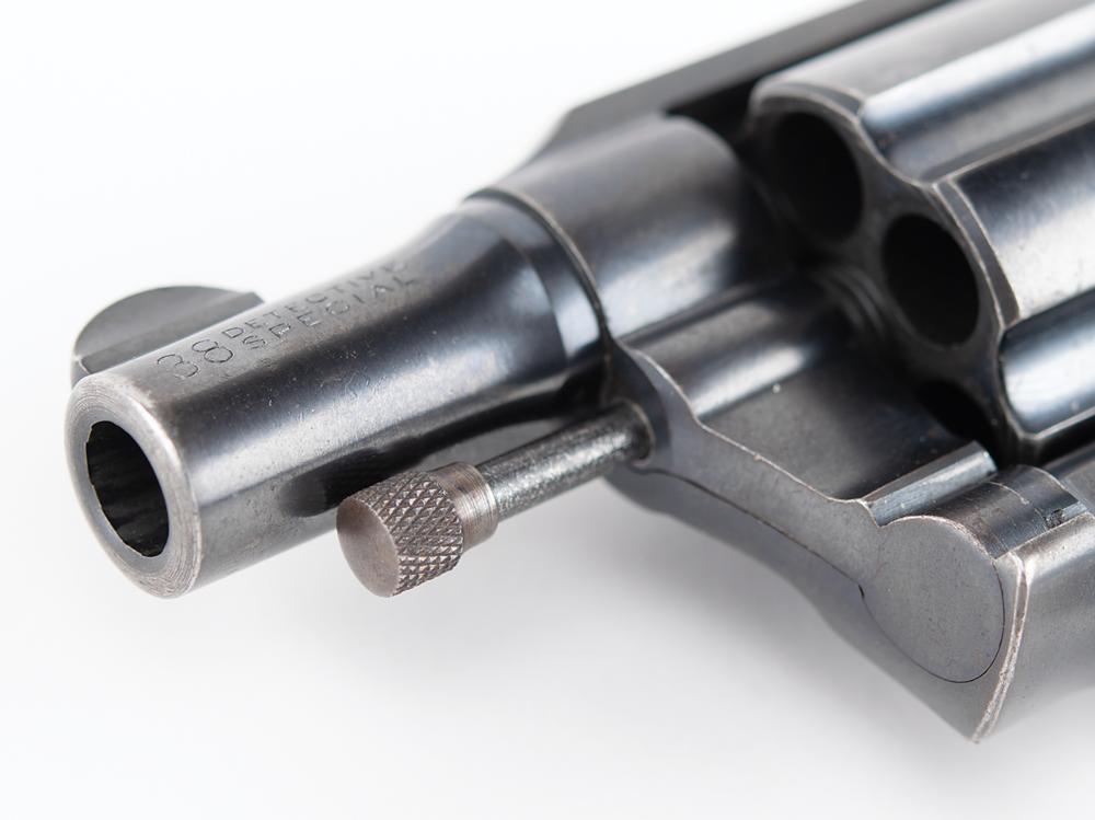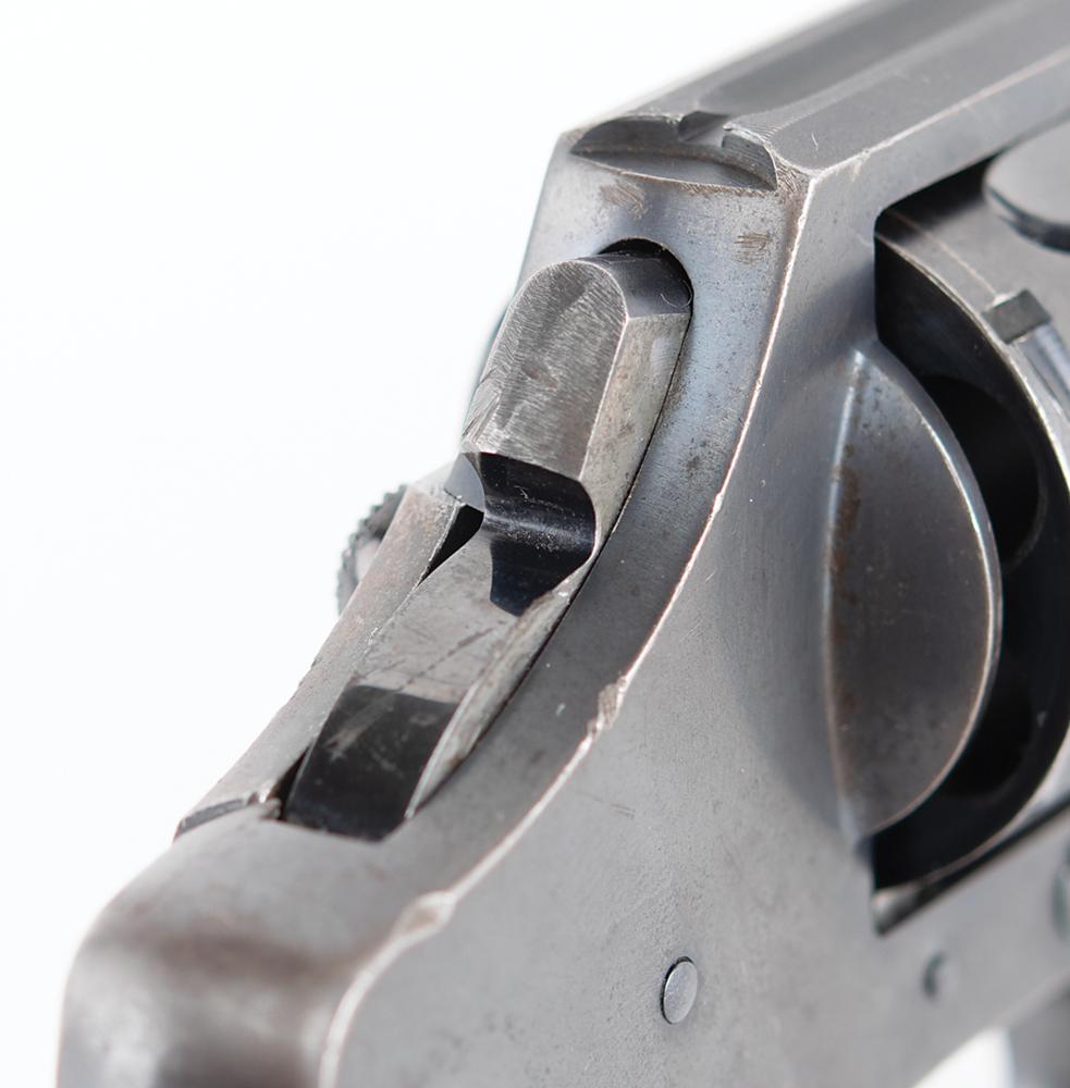 The revolver features much of its original finish, with some staining and wear to the stocks. It shows wear commensurate with a 93-year-old revolver which was likely carried in overcoat and suit pockets; the 'bobbed hammer' made it easier to conceal and less likely to catch on clothing in a quick-draw situation. The serial number is found in two places on the inside of the revolver: along the grip strap and on the reverse of the side plate. The side plate does show thinning and browning of the finish. The hammer is bobbed and the cut surface is dulled. The action is tight and the revolver really only shows exterior wear. This gun was not very old when it was recovered at the crime scene in a trail of blood and then thrust into a criminal investigation which yielded no suspects.