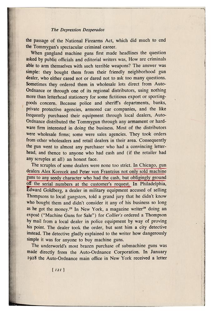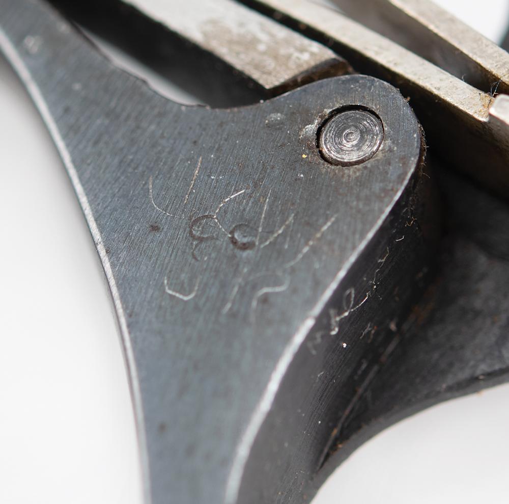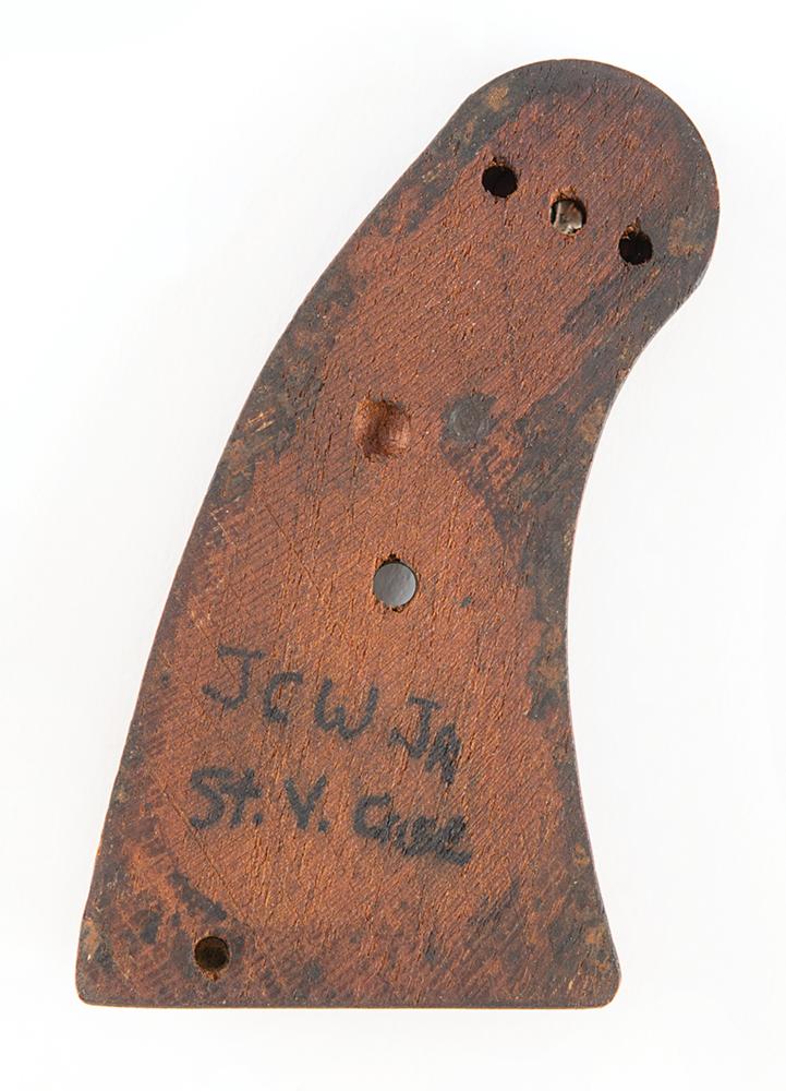 The reverse of the grips are both inscribed in ink, “JCW Jr. St. V. Case," evidently provenance markings attributing it to the collection of Joseph C. Wilimovsky, Jr. He was a criminologist affiliated with Calvin Goddard Associates, a pioneering forensic ballistics firm that worked on the St. Valentine’s Day investigation. According to an accompanying letter by Neal Trickel, Cook County coroner Herman Bundesen turned the weapon over to a criminologist for firearms identification work, which we know was undertaken by the Goddard Crime Lab. We assume that the gun passed into Wilimovsky's possession sometime during the 1930s, as the crime lab was sold to the Chicago Police Department in 1938. Trickel writes that he acquired the gun from a relative of the criminologist in the 1980s, after it had been in the family for more than fifty years.