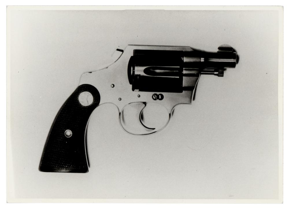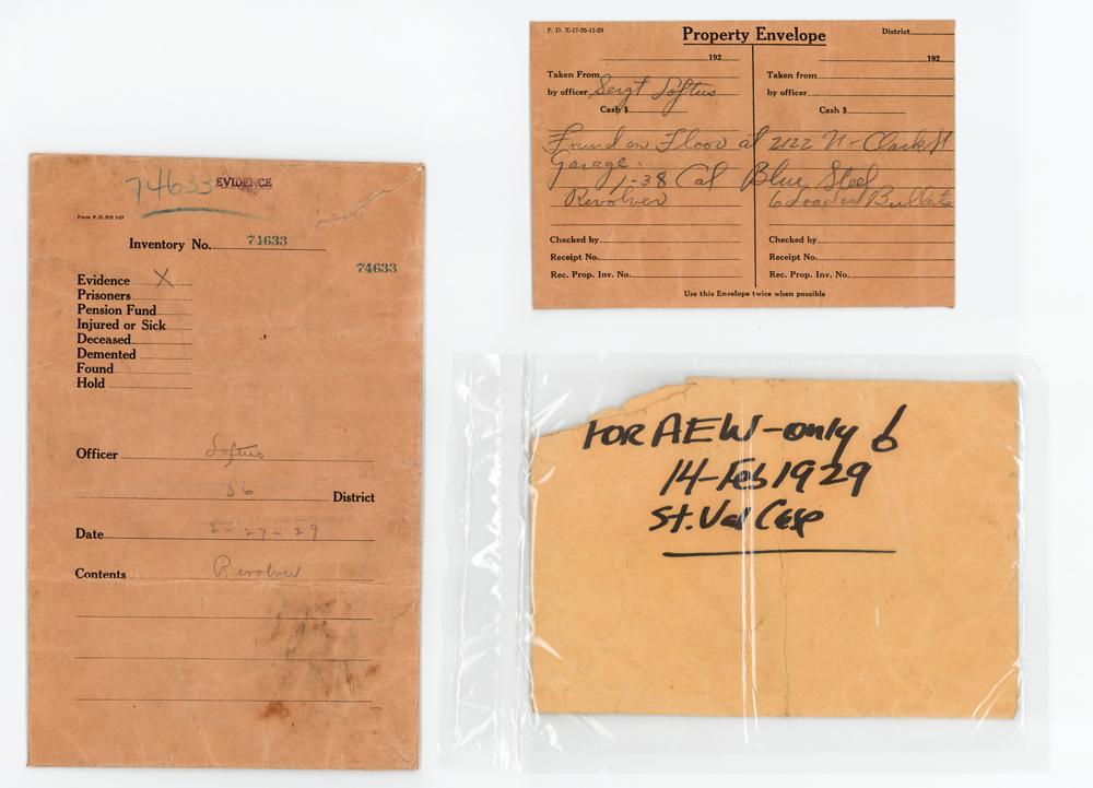 Where this revolver traveled in the eight months before the Saint Valentine’s Day Massacre is open to conjecture. What is known is that this .38 Detective Special was found by Sgt. Thomas J. Loftus in the S-M-C Cartage Company's warehouse at 2122 N. Clark Street in a bloody mess with several dead men and a pile of empty .45 ACP cartridge cases. In his sworn statement made at the District Attorney's office later that day, Loftus mentioned discovering the ".38 caliber Colt Revolver Detective Special, with a one-inch barrel" on the floor of the facility. The revolver is also seen in the corner of a crime scene image taken at the bloody site. The police and investigators linked the gun to Frank Gusenberg, believing that it fell from his pocket as he attempted to crawl to safety following the massacre. No other firearms were recovered at the site, making this revolver the only firearm available to the public that originates directly from the scene of the St. Valentine’s Day Massacre. Includes the original Chicago Police Department property envelope and evidence bag, filled out in pencil with Sgt. Loftus' name and the important note: "Found on floor at 2122 N. Clark St. Garage, 1-38 Cal. Blue Steel Revolver."