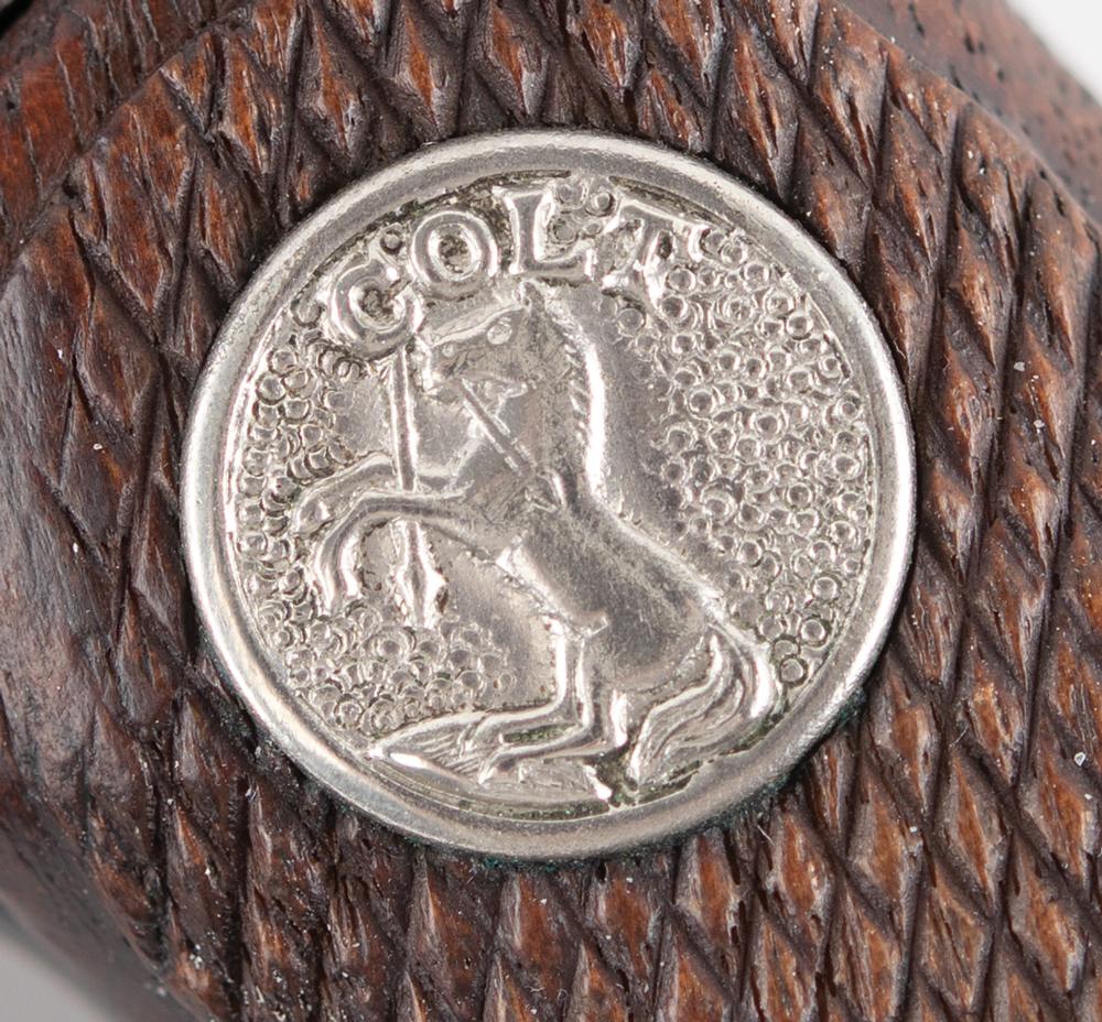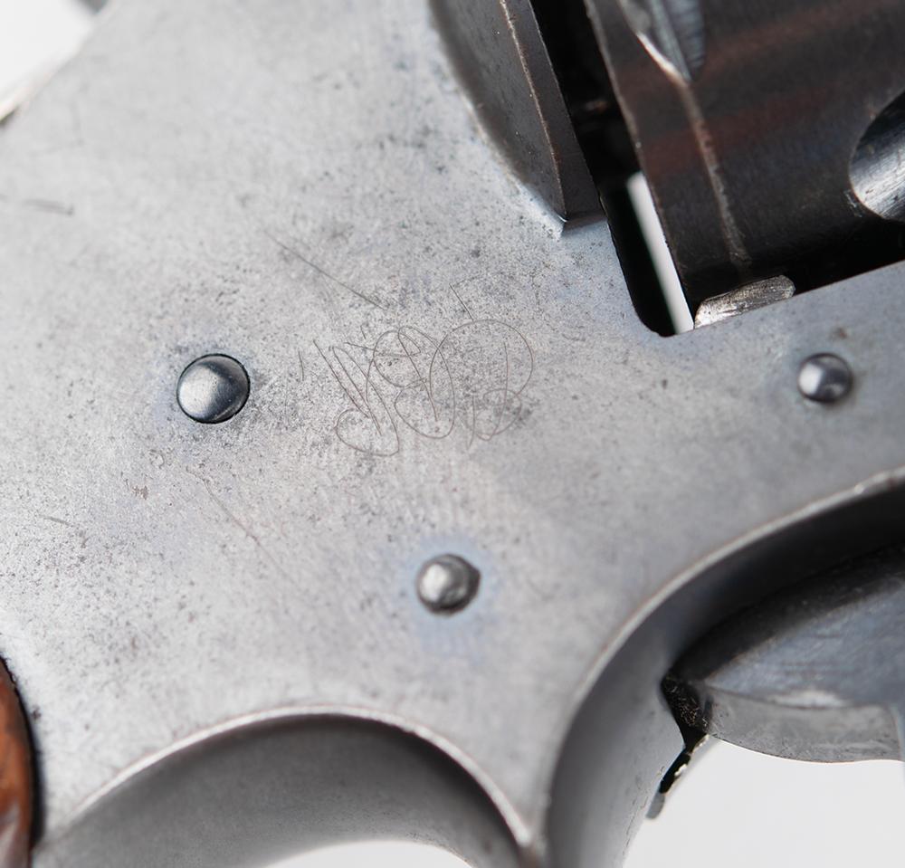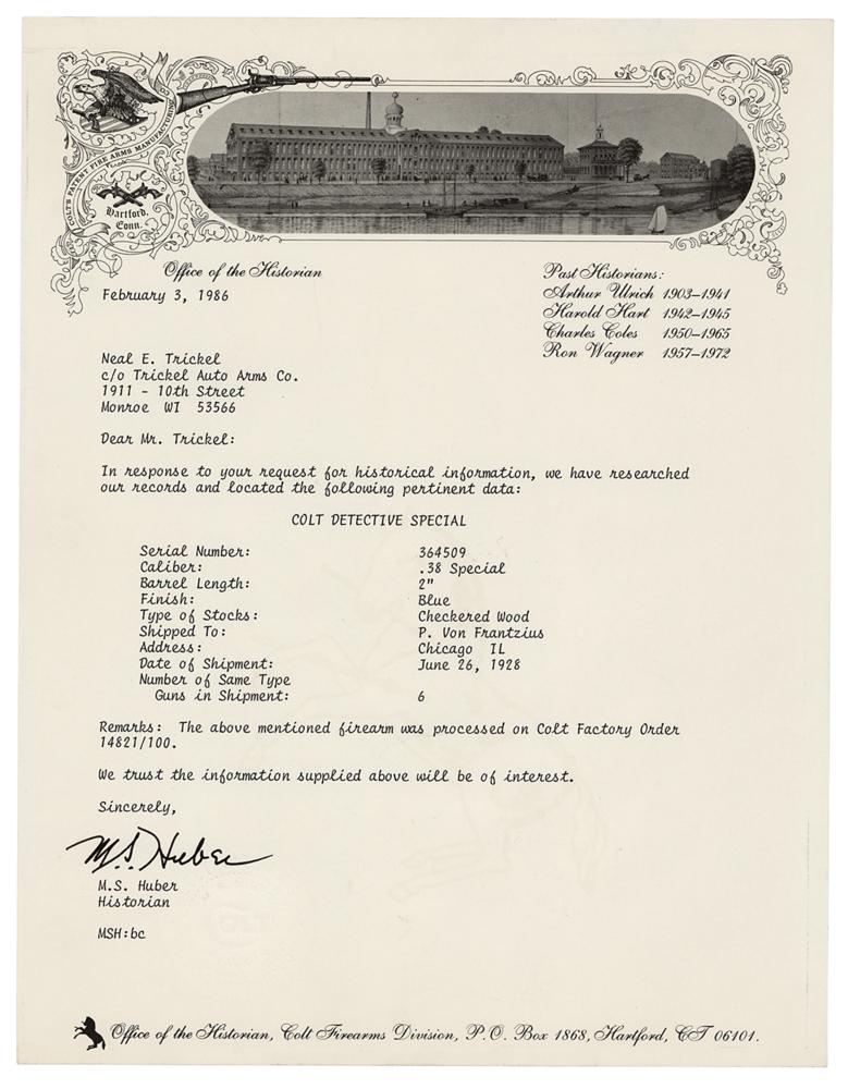 The revolver is accompanied by a Colt Archive letter dated February 3, 1986, indicating that this Colt Detective Special, serial number 364509, was shipped in a batch of six to Chicago gun dealer P. Von Frantzius on June 26, 1928. Peter von Frantzius was a well-known firearms distributor, later dubbed by the press as 'The Armorer of Gangland.' He is known as an almost-exclusive supplier of firearms to the Chicago Mob: one of the two recovered Tommy guns linked to the St. Valentine's Day Massacre was also shipped to Frantzius. According to legend, the firm offered a $2.00 service to file away the serial numbers and bob the hammers, both attributes found on this Detective Special. After the gun was recovered, crime lab investigators were able to raise the obliterated serial number.