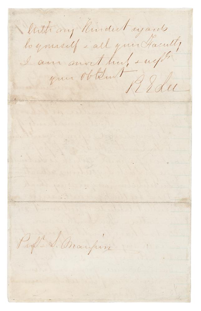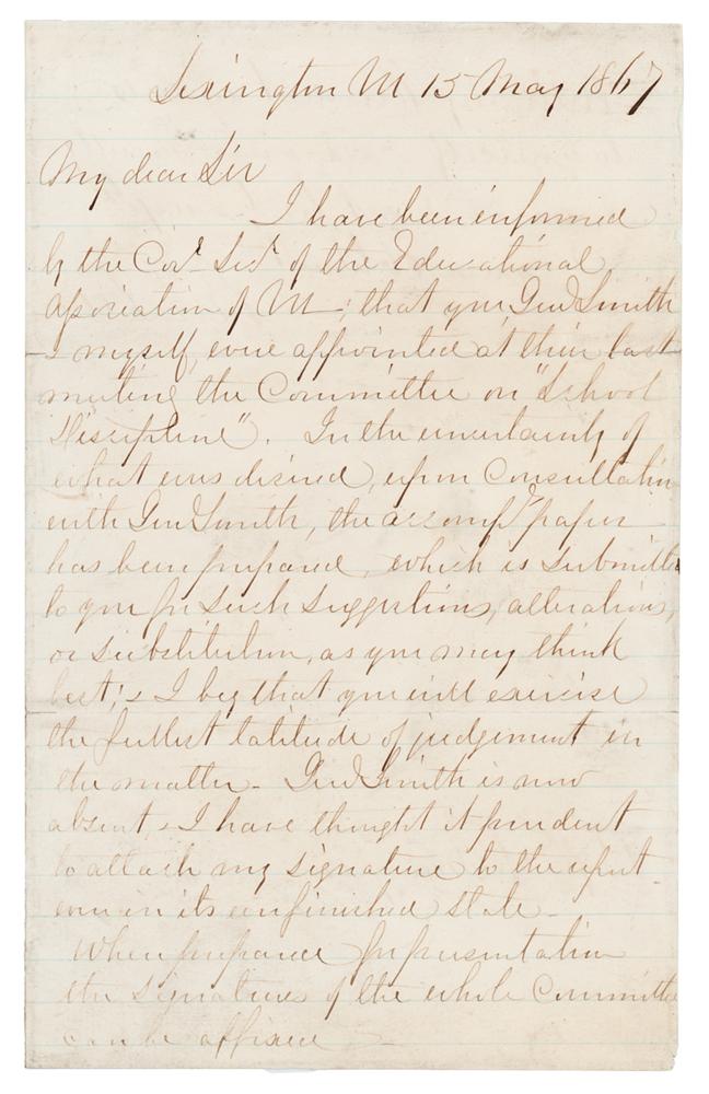 ALS signed “R. E. Lee,” one page both sides, 5 x 8, May 15, 1867. Addressed to Professor Socrates Maupin, a handwritten letter from Robert E. Lee as president of Washington College in Lexington, Virginia, in part: "I have been informed by the?Educational Association of VA that you, Genl Smith, & myself were appointed at their last meeting the Committee on ‘School Discipline.’ In the uncertainty of what was desired, upon consultation with Genl Smith, the accomp paper has been prepared, which is submitted to you for such suggestions, alterations, or substitution, as you may think best; & I beg that you will exercise the fullest latitude of judgment in the matter. Genl Smith is now absent. I have thought it prudent to attach my signature to the report even in its unfinished state. When prepared for presentation the signatures of the whole committee can be affixed. With my kindest regards to yourself & all your Faculty.” In fine condition.