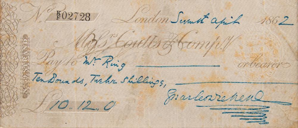 Coutts & Company bank check, 7 x 3, filled out and signed by Charles Dickens, payable to Ms. Ring for £10.12, April 7, 1862. Double-matted with a photo to an overall size of 10.25 x 14. 5. In very good to fine condition, with scattered creasing and staining.