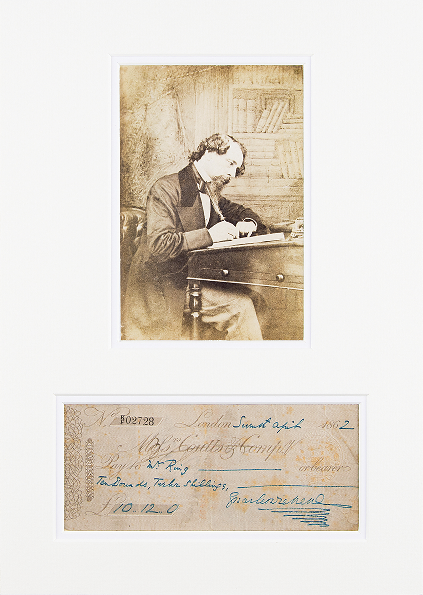 Coutts & Company bank check, 7 x 3, filled out and signed by Charles Dickens, payable to Ms. Ring for £10.12, April 7, 1862. Double-matted with a photo to an overall size of 10.25 x 14. 5. In very good to fine condition, with scattered creasing and staining.