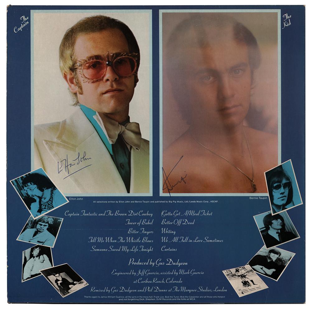 Captain Fantastic and the Brown Dirt Cowboy album by Elton John, signed on the inner gatefold in blue ballpoint by John and Bernie Taupin. In fine condition. The brown vinyl record is included, as are the album's "Scraps" and "Lyrics" booklets.