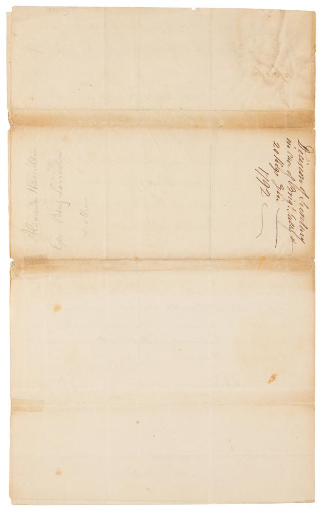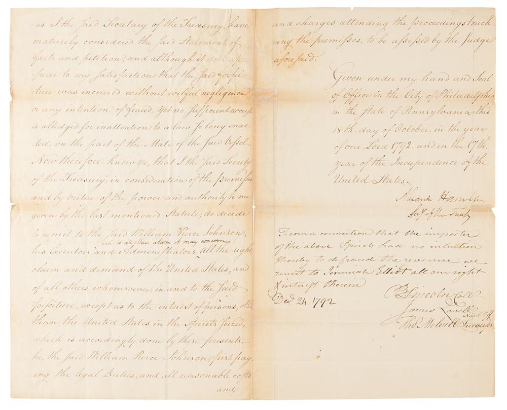 Manuscript DS, signed “Alexandr Hamilton, Secy of the Treasy,” three pages on two adjoining sheets, 7.75 x 12.75, October 18, 1792. As taxes on imports were a part of the Treasury department's responsibility from its inception, this document finds Hamilton making a formal finding in a case involving import duties on distilled spirits. One William Pierce Johnson, of Newbury Port, had appealed his forfeiture of “the Brigantine Sally and twenty kegs of gin” on the grounds that the law under which the property was seized had since been repealed by a new Act. Hamilton, “by virtue of the power and authority to me given,” has “maturely considered the said statement of facts and petition, and although it doth appear to my satisfaction that the said forfeiture was incurred without willful negligence or any intention of fraud, yet no sufficient excuse is alleged for inattention to a law so long enacted on the part of the Mate of the said Vessel.” He therefore grants Johnson's petition, and orders that the forfeiture will be suspended, while “Johnson [will] pay?the legal duties, and all reasonable costs and charges attending the proceedings?to be assessed by the Judge aforesaid.” Signed at the conclusion by Hamilton, and countersigned by Benjamin Lincoln as collector, James Lovell as a naval officer, and Thomas Melville as surveyor. Lincoln adds a five-line note, stating that “the importer?had no intention to defraud the Revenue.” The first page retains the original embossed paper seal. In very good condition, with light toning and creasing, small old repairs, and archival reinforcement along the hinge. As the nation's first Treasury Secretary, Hamilton enacted economic reforms aimed at promoting American industry. A key plank of his platform was an elaborate system of duties, tariffs, and excise taxes on goods from abroad, designed to make imports more expensive than domestic products. Hamilton's authority was further augmented by Congress by its adaptation of Section 43 of the March 3, 1791 'U.S. Distilled Spirits Act,' which granted Hamilton 'Summary Judgment' powers to make decisions in contentious federal tax-related issues.