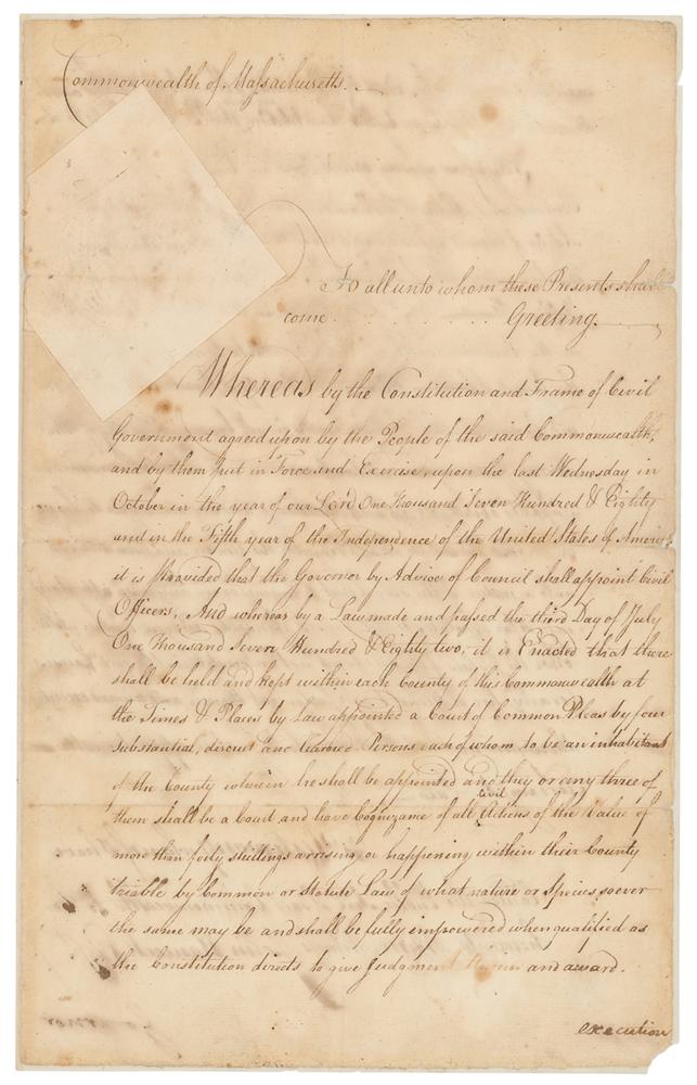 Manuscript DS, three pages, 7.75 x 12.5, March 6, 1783. As governor of Massachusetts, Hancock names a member to the Scarborough Court of Common Pleas, in part: “It is provided that the Governor by Advice of Council shall appoint Civil Officers?there shall be held and kept within each County?a Court of Common Pleas by four substantial discreet and learned Persons?they or any three of them shall be a Court and have Cognizance of Civil Actions of the Value of more than forty shillings?I therefore reposing special Trust and Confidence in the Loyalty Prudence and Ability of William Thompson Esq?.[appoint him] one of the Justices of the Court of Common Pleas.” Signed prominently at the conclusion by John Hancock, and countersigned John Avery as secretary. The first page retains the original embossed paper seal. In very good to fine condition, with scattered staining, small areas of paper loss, and overall silking for reinforcement.