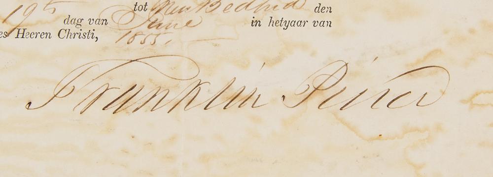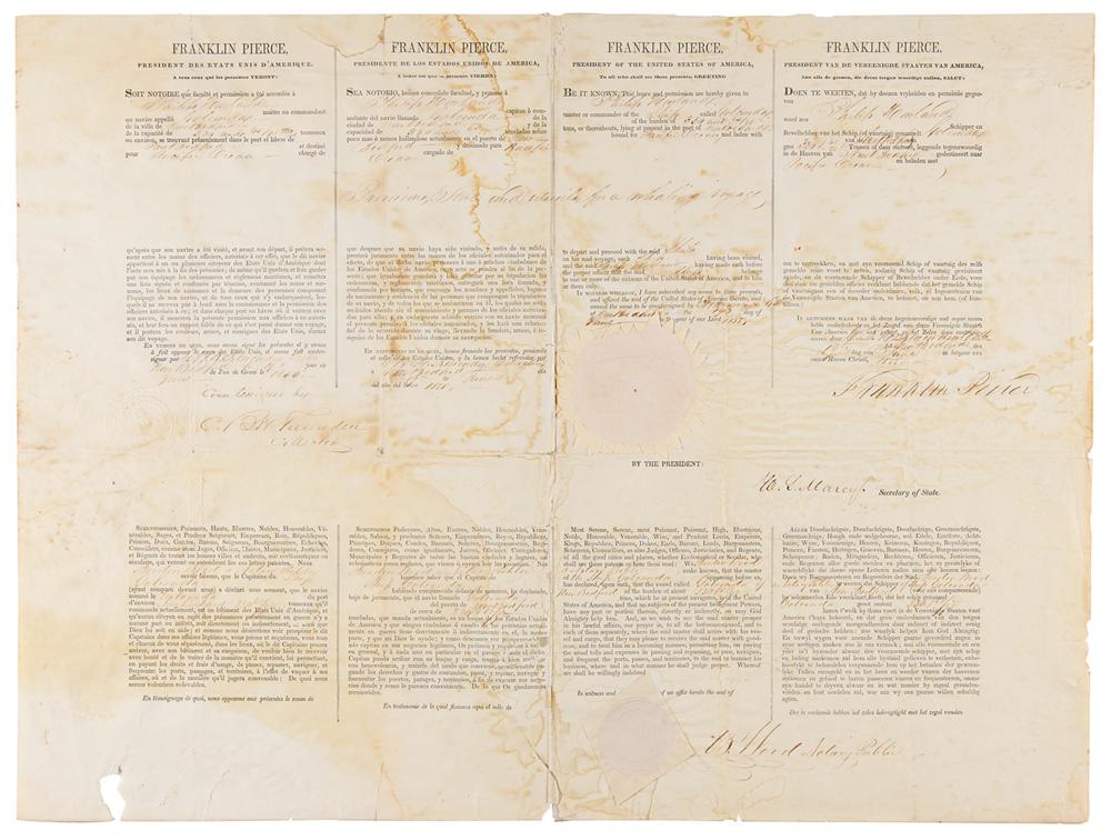 Partly-printed DS as president, one page, 22 x 16.75, June 19, 1855. Four-language ship’s pass issued to “Philip Howland master or commander of the Ship called Golconda?lying at present in the port of New Bedford bound for the Pacific Ocean and laden with Provisions, stores and utensils for a whaling voyage.” Prominently signed in the fourth panel by Franklin Pierce and countersigned by Secretary of State William Marcy. The original white paper seals remain affixed to the third panels. In very good condition, with staining and wrinkling, areas of paper loss, and tear and fold separations repaired with tape on the reverse.