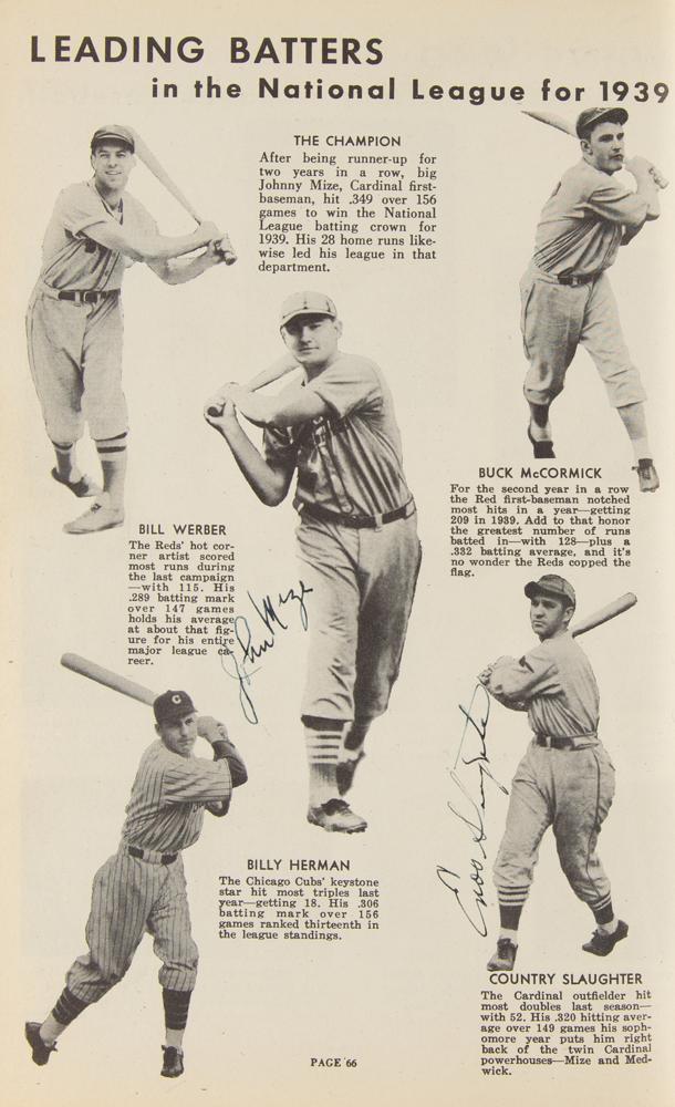 Signed book: Who's Who in the Major Leagues. Chicago: B. E. Callahan, 1940. Softcover, 6 x 9, 128 pages. Signed inside in fountain pen or pencil by forty-four players featured in the book, all signing next to their image, including: Mike Tresh, Jack Knott, Don Kolloway, Pete Fox, Schoolboy Rowe, Birdie Tebbetts, Hal Newhauser, Johnny Mize (2), Enos Slaughter (2), Mort Cooper, Terry Moore (2), Jimmy Brown, Bob Bowman, Don Gutteridge, Stu Martin, Doc Medwick, Ernie White, Buzzy Wares, Gene Lillard, Hugh Casey, Harry Lavagetto, Gene Moore, Luke Hamlin, Roy Cullenbine, Pee Wee Reese, Gerry Nugent, Joe Marty, Ray Martin, Kirby Higbe, Hugh Mulcahy, Ike Pearson, Del Young, Ben Warren and a few others. In very good condition, with handling wear, some signatures light but legible, and some minor staining to a few pages.