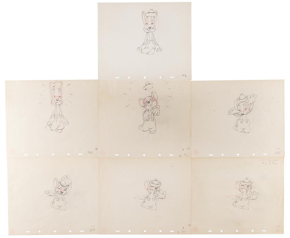 (Walt Disney Studios, 1936) Seven original semi-sequential production drawings featuring Abner from The Country Cousin, showing him drunk after imbibing too much champagne. In this humorous sequence, Abner looks woozy and his hat pops off of his head before landing over his eyes. Accomplished in graphite and colored pencil on untrimmed 12 x 10 animation paper, marked in the lower right with numbers: 19.5, 20, 22, 25, 27, 30, and 31. Images measure from 3.5 x 4 to 3.25 x 7. In overall fine condition.
