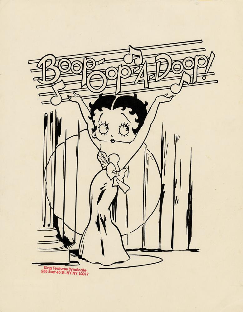 (King Features Syndicate, 1980s) Original pen and ink merchandising artwork by Ned Sonntag featuring Betty Boop on stage, with "Boop-Oop-A-Doop!" above. Accomplished in pen and ink on off-white 11 x 14 lightweight cardstock, stamped in the lower left by King Features Syndicate. In fine condition. Sonntag began his cartoonist career in the underground comix scene, later becoming a leading illustrator for Betty Boop merchandising art, distributed by King Features.