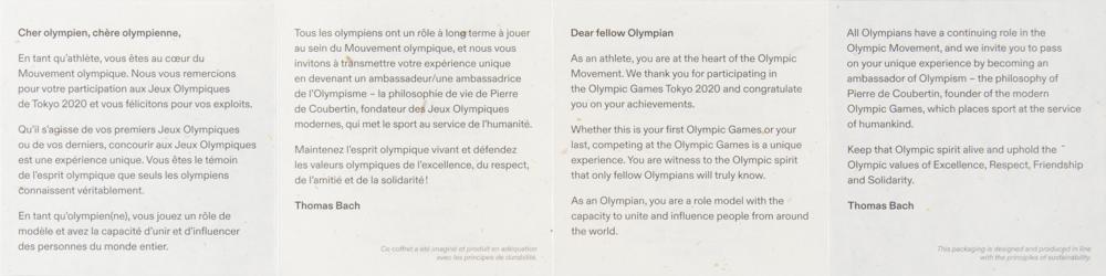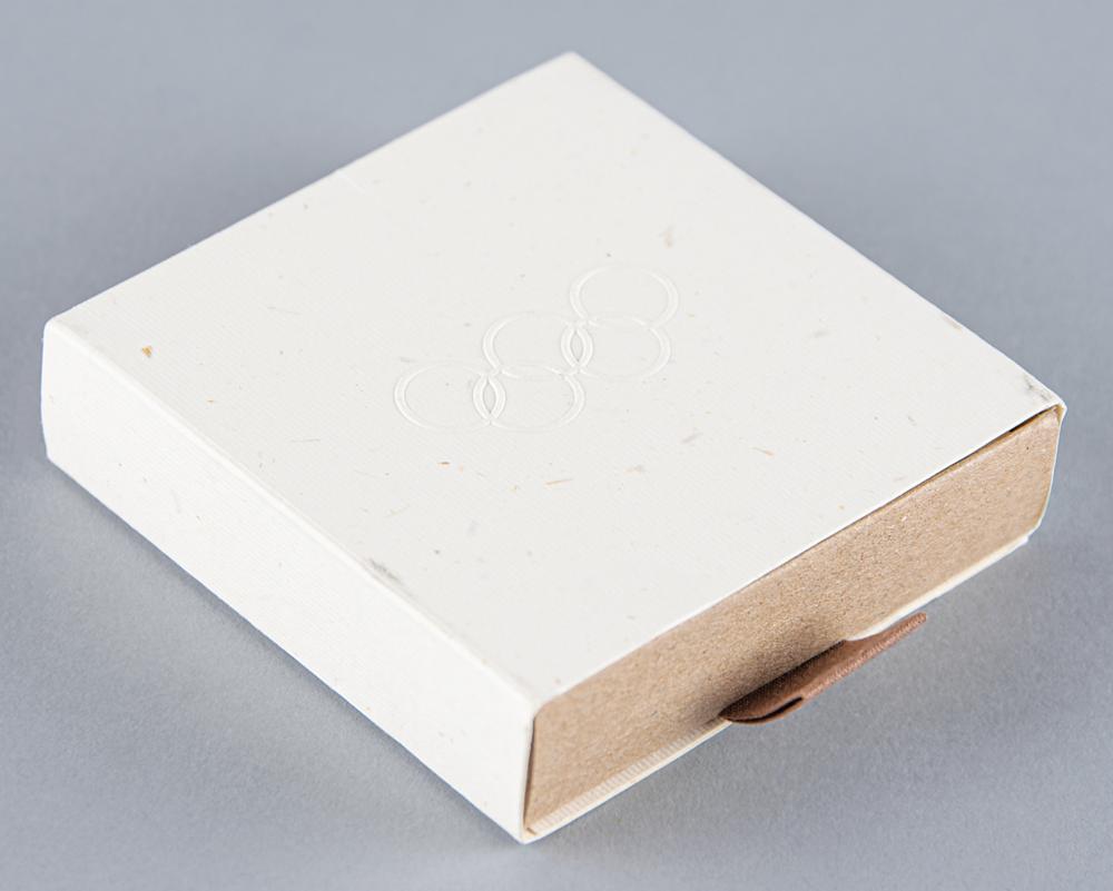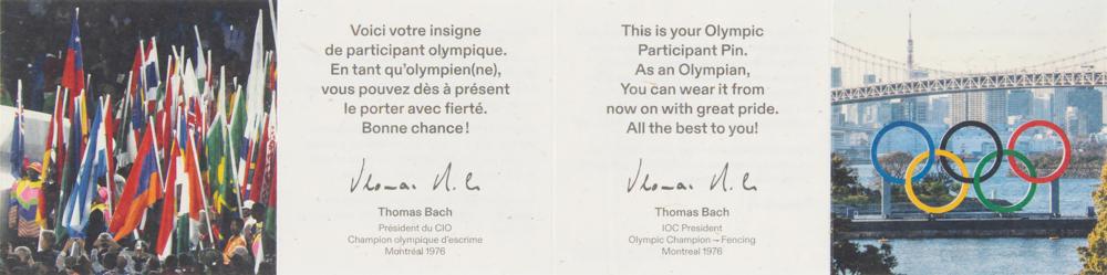 Official gold-plated participation pin from the Tokyo 2020 Summer Olympics. 1 gm, 12 mm x 19 mm, which features the Olympic rings under a flaming 2020 torch. Reverse features the mint mark, "Bertoni, Milano," and the serial number, "20-05522." Includes the original paper presentation box with matching label, which bears some slight scuffing. As no participation medals were issued for the 2020 Tokyo Games, the athlete’s participation pin has become the de facto 2020 Tokyo 'participation medal' for collectors.
