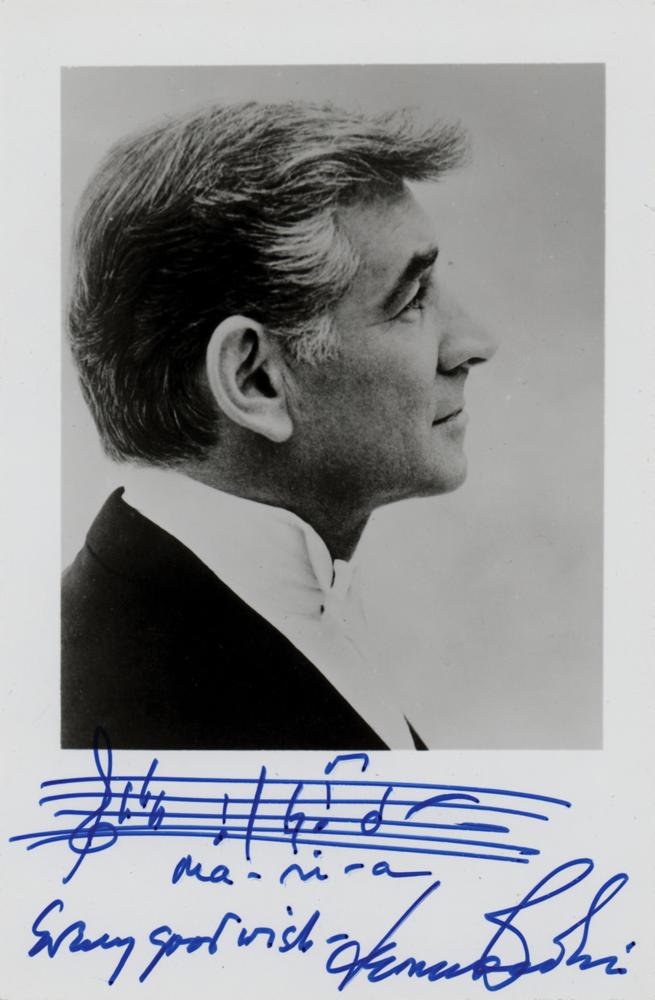 Glossy 3.5 x 5.5 photo of Leonard Bernstein in profile, signed below in blue felt tip, "Every good wish—Leonard Bernstein," who adds two bars of music from the West Side Story song 'Maria.' In fine condition.