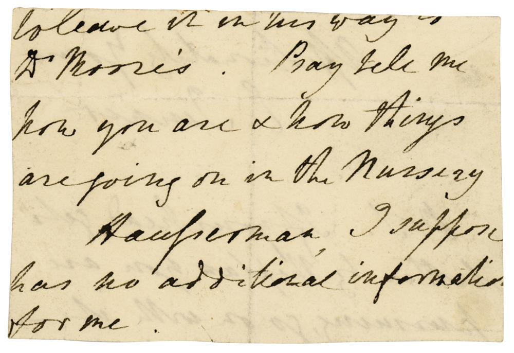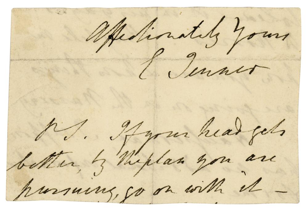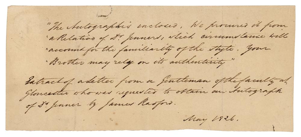 English physician and scientist (1749-1823) often called the ‘father of immunology,’ who successfully tested his smallpox inoculation in 1796. Ink signature, "Affectionately yours, E. Jenner, P.S. If your head gets better, the plan you are pursuing, go on with it,” on a white 4 x 2.75 slip clipped from an autograph letter; the reverse also bears writing in Jenner's hand. In fine condition, with central vertical and horizontal folds. Accompanied by two unsigned engravings and a provenance note indicating that the autograph was obtained from one of Jenner's family members.