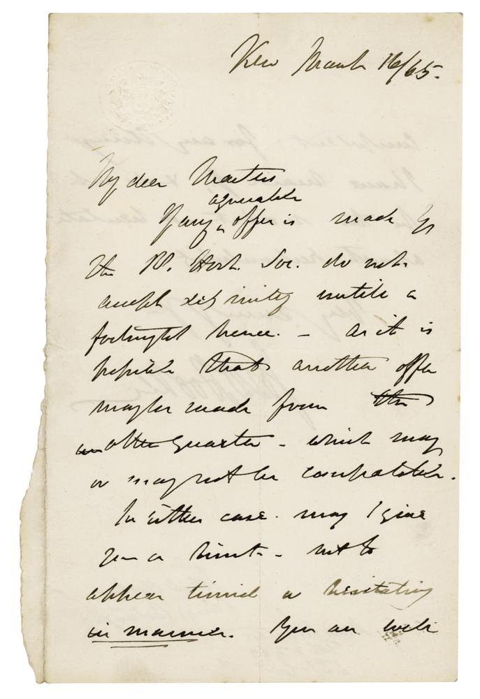 Important British botanist and explorer (1817-1911) who was Charles Darwin's closest friend; he served as director of the Royal Botanic Gardens, Kew, for 20 years. ALS signed “Jos. D. Hooker,” one page both sides, 4.5 x 7.25, embossed Royal Gardens, Kew, letterhead, March 16, 1865. Handwritten letter to English botanist and taxonomist Maxwell T. Masters, offering career advice. In part: "If any agreeable offer is made by the R. Hort. Soc. do not accept?untill a fortnight hence—as it is possible that another offer may be made from the other quarter?In either case, may I give you a hint—not to appear timid or hesitating in manner. You are well competent for any thing I have heard of; & do not be too modest." In fine condition, with one rough edge.