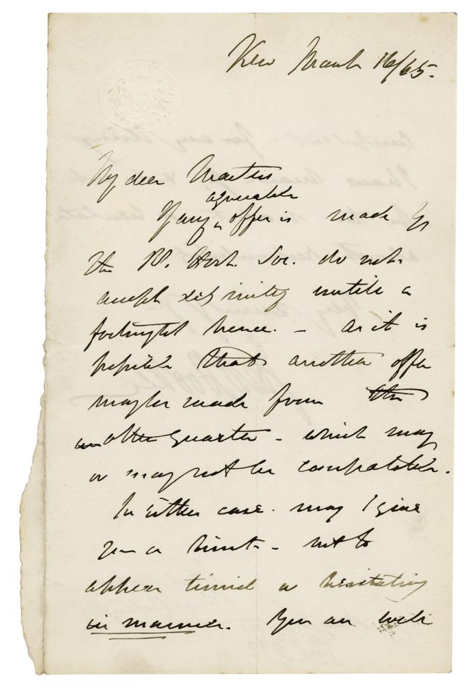 Important British botanist and explorer (1817-1911) who was Charles Darwin's closest friend; he served as director of the Royal Botanic Gardens, Kew, for 20 years. ALS signed “Jos. D. Hooker,” one page both sides, 4.5 x 7.25, embossed Royal Gardens, Kew, letterhead, March 16, 1865. Handwritten letter to English botanist and taxonomist Maxwell T. Masters, offering career advice. In part: "If any agreeable offer is made by the R. Hort. Soc. do not accept…untill a fortnight hence—as it is possible that another offer may be made from the other quarter…In either case, may I give you a hint—not to appear timid or hesitating in manner. You are well competent for any thing I have heard of; & do not be too modest." In fine condition, with one rough edge.