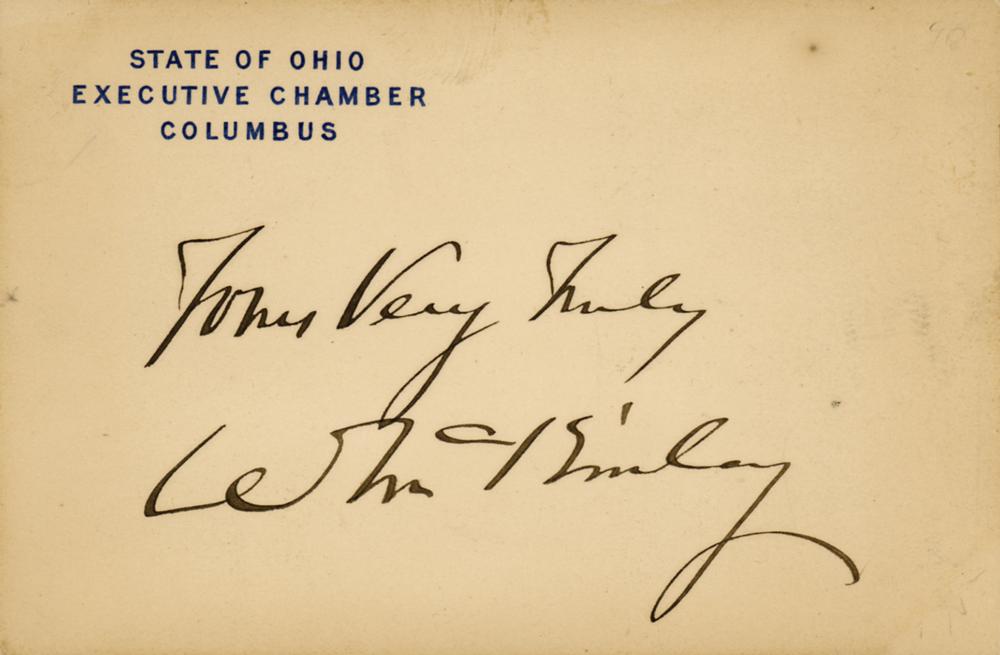 Appealing ink signature, "Yours Very Truly, W. McKinley,” on an off-white 4.25 x 2.75 State of Ohio, Executive Chamber card. In fine condition, with faint overall toning.