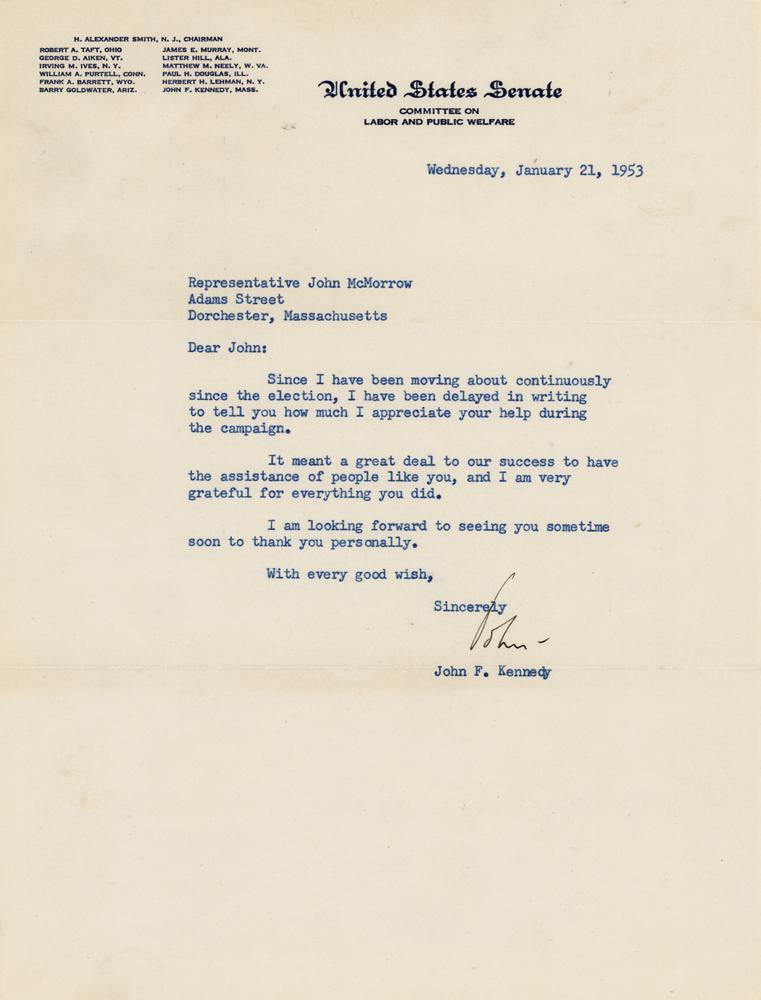 TLS signed “John,” one page, 8 x 10.5, United States Senate, Committee on Labor and Public Welfare letterhead, January 21, 1953. Letter to fellow Harvard graduate and Massachusetts Congressman John P. McMorrow, in full: "Since I have been moving about continuously since the election, I have been delayed in writing to tell you how much I appreciate your help during the campaign. It meant a great deal to our success to have the assistance of people like you, and I am very grateful for everything you did. I am looking forward to seeing you sometime soon to thank you personally." In fine condition. Accompanied by the original mailing envelope with preprinted free frank.