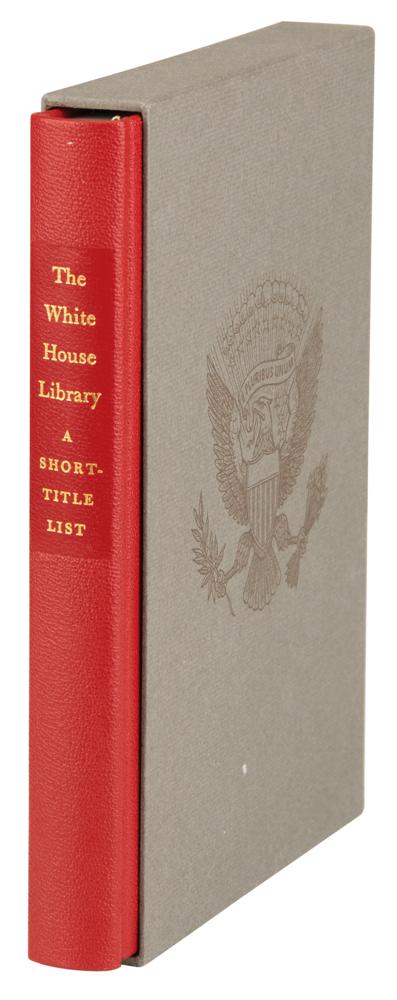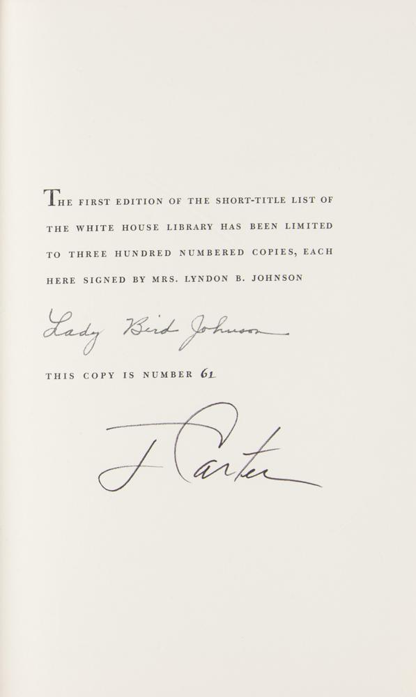 Signed book: The White House Library: A Short-Title List. Limited first edition, numbered 61/300. Washington, D.C.: The White House Historical Association, 1967. Hardcover with slipcase, 6.25 x 9.5, 219 pages. Signed on the colophon in black ink by Lady Bird Johnson, and in black felt tip by Jimmy Carter. In very fine condition.