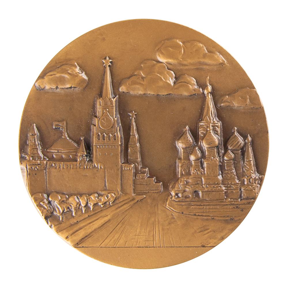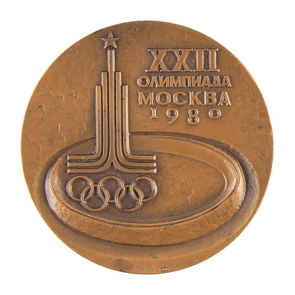 Participation medal issued for the Moscow 1980 Summer Olympics. Tombac, 60 mm, 125 gm, by Angelina Leonova. The front features the Moscow Games emblem above the Olympic stadium and raised Cyrillic lettering; the reverse bears a handsome detailed view of the Red Square in Moscow. Includes its original red case.