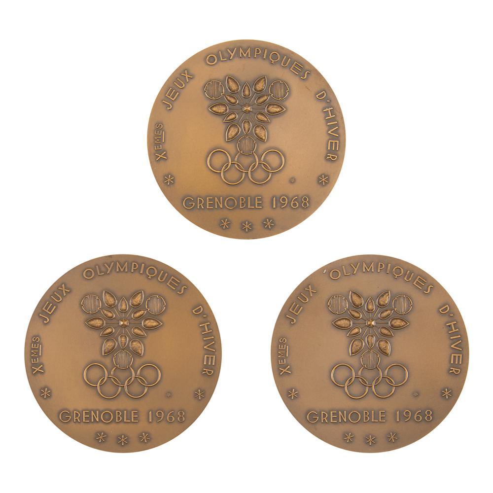 Uncommon grouping of three winner's medal proofs designed for the Grenoble 1968 Winter Olympics, for ice hockey, giant slalom, and speed skating. Bronze, 60 mm, 102 gm, by Roger Excoffon, Paris. The front, inscribed, "Xemes Jeux Olympiques D'Hiver, Grenoble 1968," features the Olympic rings; the reverse identifies the sport by text and pictogram: "Hockey Sur Glace," "Slalom Geant," and "Patinage de Vitese." All stamped "Bronze" on the edge. The Grenoble winner's medals were the first to feature a unique design on the reverse for each sport. A highly desirable proof set of pioneering Winter Olympic winner's medals.