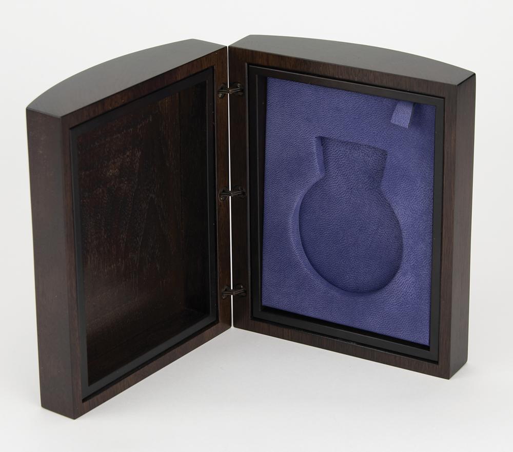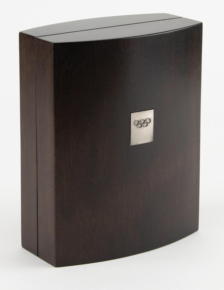 Handsome walnut presentation case for a Salt Lake City 2002 Winter Olympics silver winner's medal, measuring 6.25″ x 7.75″ x 3.5″, with a silver rectangular medallion featuring the Olympic rings inset on the front. Inside is a purple leather form-fitting holder for the medal. A finely crafted wooden case for Salt Lake's second-place prize.