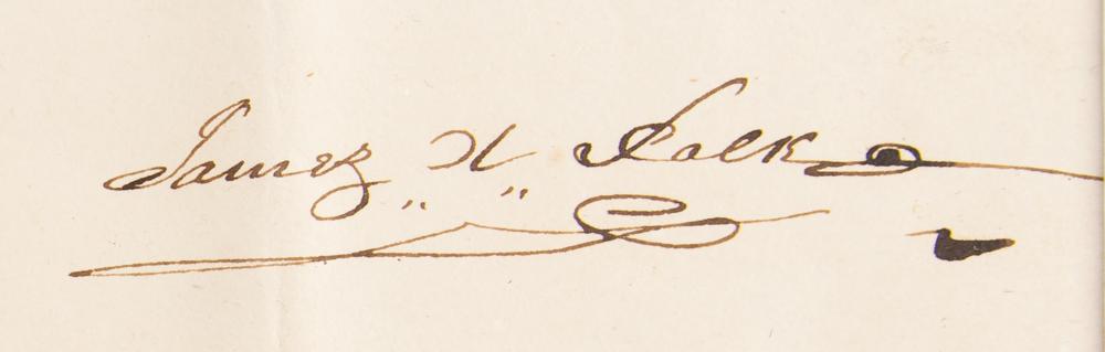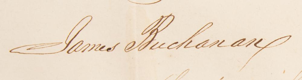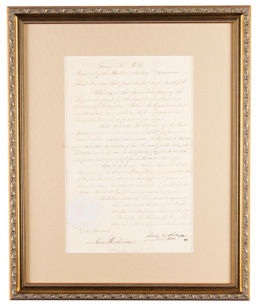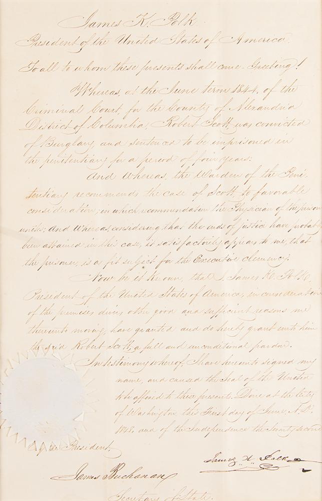 Manuscript DS, signed ?James K. Polk? as president and ?James Buchanan? as secretary of state, one page, 10 x 15.5, June 1, 1848. Robert Scott, convicted of burglary by the Criminal Court of the District of Columbia in its June session, 1844 and sentenced to a term of four years imprisonment, is granted a "full and unconditional pardon" on the recommendation of the Warden and Physician of the penitentiary, and "considering that the ends of justice have probably been obtained in this case." Boldly signed at the conclusion by President Polk and Secretary of State Buchanan. The white paper seal affixed to the lower left remains fully intact. In fine condition.