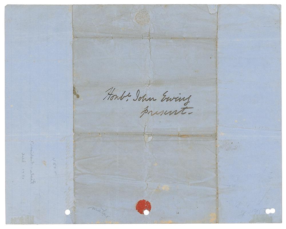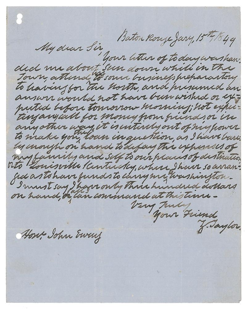 Boldly penned ALS as president-elect, signed "Z. Taylor," one page, 7.75 x 9.75, January 15, 1849. Written from Baton Rouge, a letter to John Ewing, in full: "Your letter of today was handed me about sun down while in the town attending to some business preparatory to leaving for the North, and presumed an answer would not have been wished or expected before tomorrow morning; not expecting any call for money from friends, or in any other way, it is entirely out of my power to make you the loan in question, as I have barely enough on hand to defray the expenses of my family and self to our places of destination or to Louisville Kentucky, where I have so arranged as to have funds to carry me to Washington. I must say I have only three hundred dollars on hand, all I can command at this time." Addressed on the reverse of the partial second integral page in Taylor's hand, "Honbl. John Ewing, present." In very good to fine condition, with light creasing, file holes to the left edge, and small old repairs on the reverse; the address panel is wrinkled and soiled and missing its lower third.