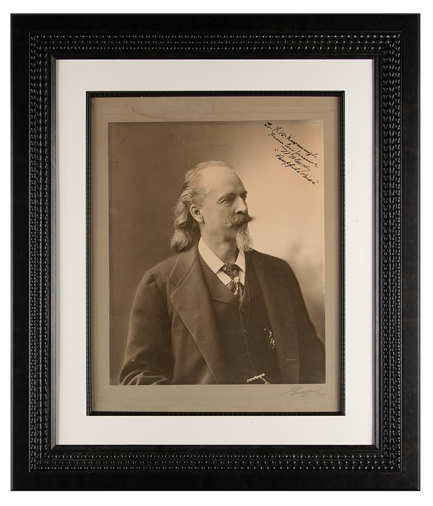 Extraordinary matte-finish 13.25 x 16.25 photo of the legendary Wild West showman by the Gessford Studio of New York, signed and inscribed in bold fountain pen, ?To?F. W. Kavanaugh, from his friend, W. F. Cody, ?Buffalo Bill.?? The lower right corner of the mount is signed in pencil by the photography studio. Impressively matted and framed to an overall size of 25.25 x 29. In fine condition, with light stains along the top and bottom edge of the mount, in no way detracting from the magnificence of the image. A magnificent oversized portrait befitting the stature of the great Buffalo Bill?undoubtedly the largest example we have offered.