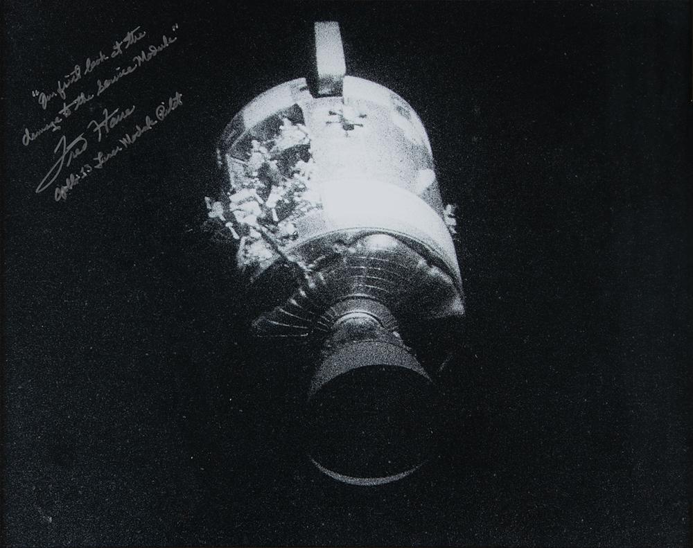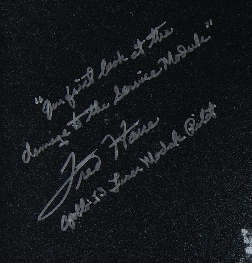 Haunting satin-finish 19.25 x 15.25 photo of the crippled Apollo 13 service module as it drifts into space, signed in silver ink, "'Our first look at the damage to the Service Module,' Fred Haise, Apollo 13 Lunar Module Pilot." Attractively matted and framed to an overall size of 28.75 x 24.75. In fine condition.