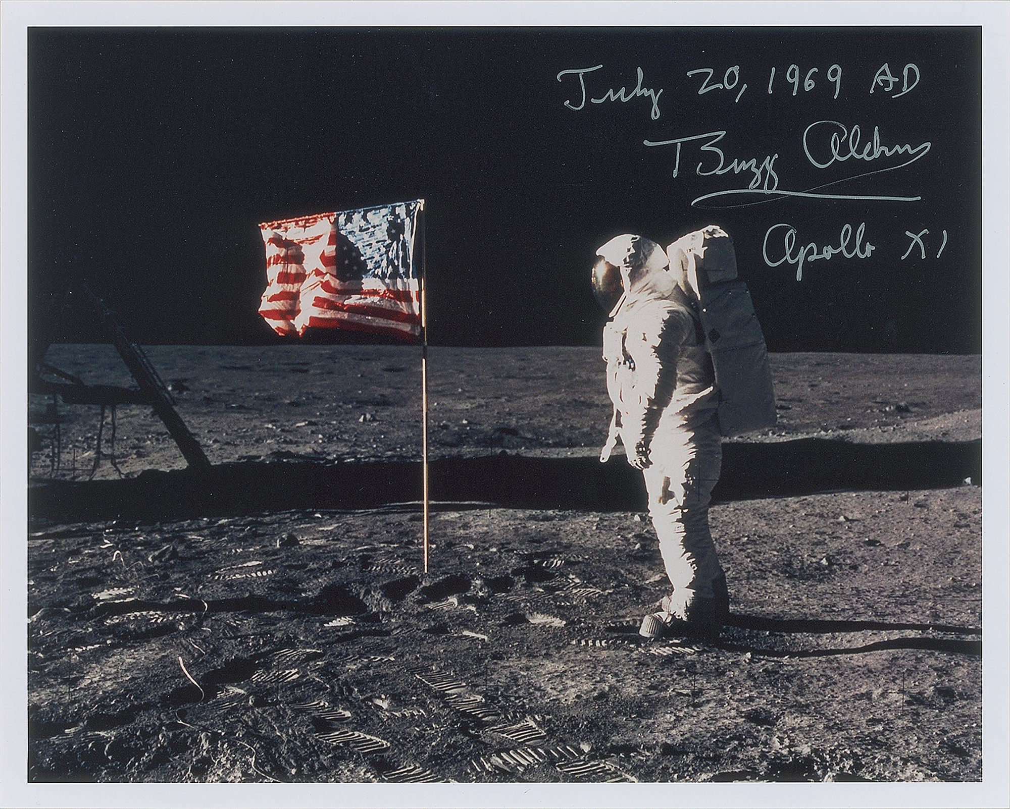 Color satin-finish 10 x 8 full-length photo of Aldrin standing next to the American flag on the lunar surface, signed in silver ink, "July 20, 1969 AD, Buzz Aldrin, Apollo XI." In very fine condition.