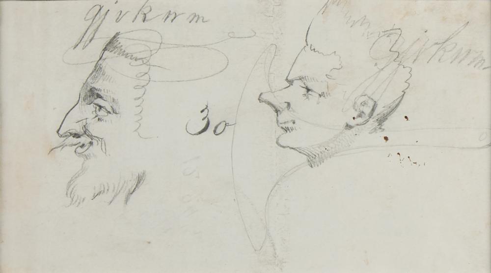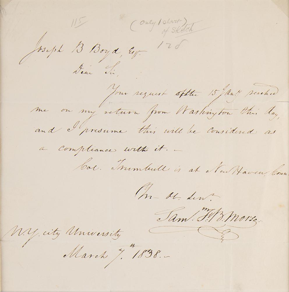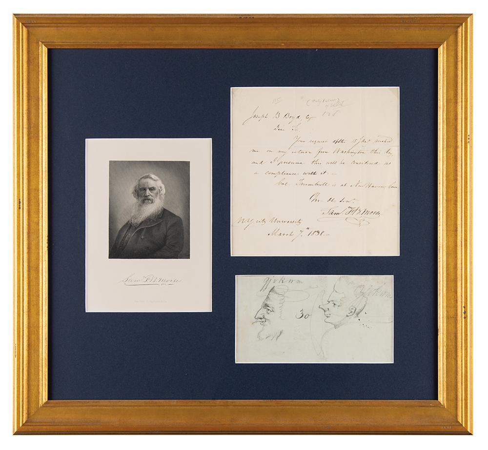 ALS signed “Sam. F. B. Morse,” one page, 7.75 x 7.75, March 7, 1838. Addressed from "N. Y. City University," a handwritten letter to Joseph B. Boyd, in full: “Your request of the 15th Jany reached me on my return from Washington this day, and I presume this will be considered as a compliance with it. Col. Trumbull is at New Haven Conn.” Another hand has added to the top in pencil, “(only 1 sheet) of sketch,” which alludes to an accompanying sheet of graphite drawings that is attributed to Morse. Unsigned, the sheet contains sketches of the faces of two men in profile and a curved tool or blade. Both the letter and sketch sheet are archivally matted and framed with an engraved portrait (bearing a facsimile signature) to an overall size of 21.5 x 19.5. In fine condition.