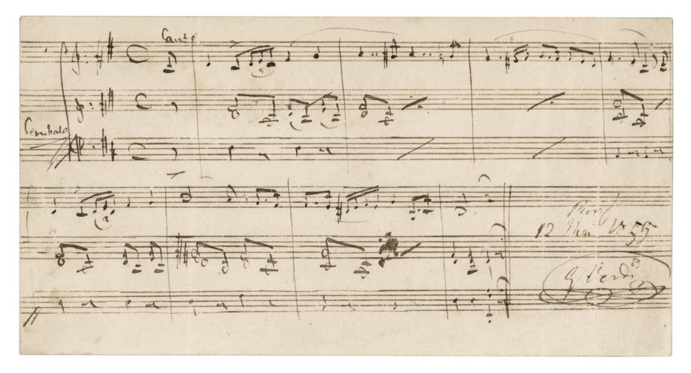 AMQS on an off-white 5.5 x 2.75 slip, dated and signed at the conclusion in ink, "Paris, 12 Mai 1855, G. Verdi." Verdi pens nine bars of music in a three-stave system from his grand opera 'Les vêpres siciliennes [The Sicilian Vespers].' In fine condition. Verdi's opera would premiere at the Paris Opera one month later on June 13, 1855. The work followed immediately after Verdi's three great mid-career masterpieces, Rigoletto, Il trovatore, and La traviata of 1850-1853.