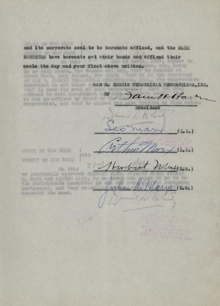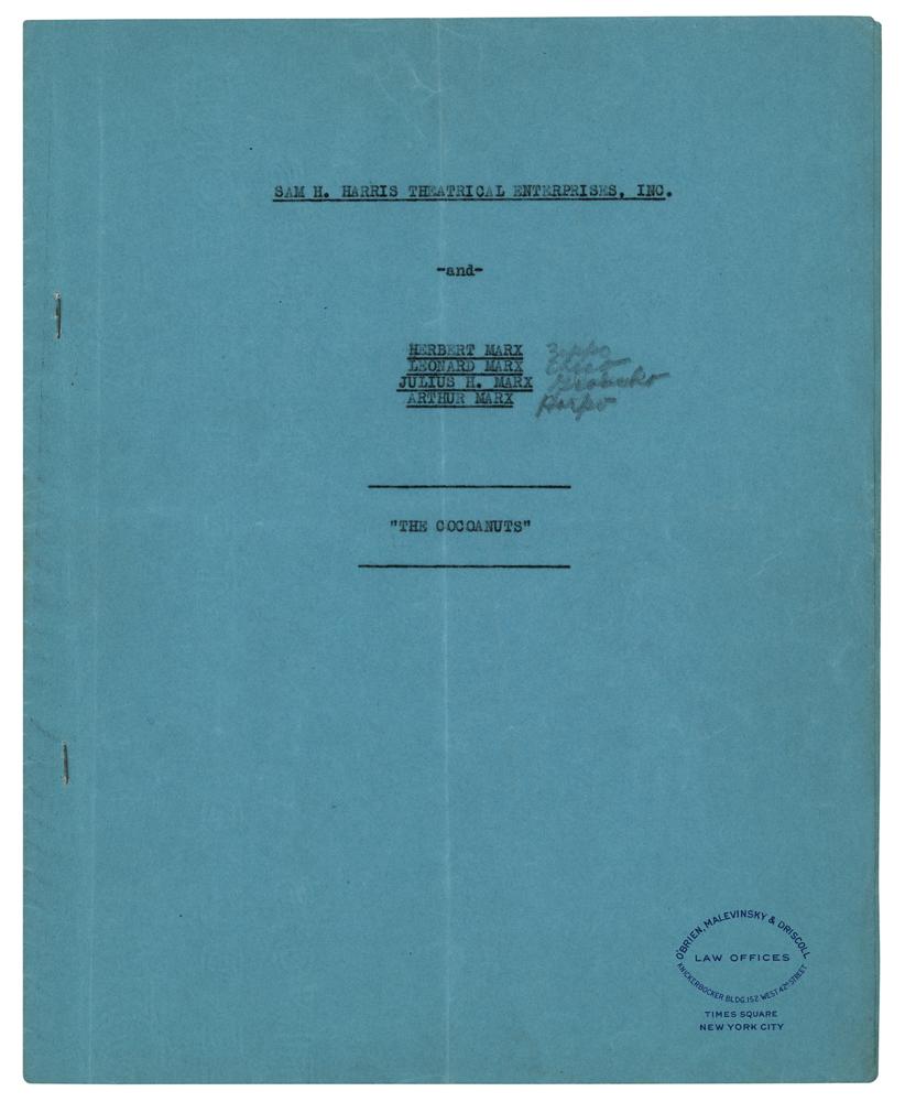 DS, signed “Leo Marx,” “Arthur Marx,” “Herbert Marx,” and “Julius H. Marx,” five pages, 9 x 11.25, September 23, 1927. Memorandum of agreement between Sam H. Harris Theatrical Enterprises and the Marx Brothers, with all opting to “extend the period of said agreement for the theatrical season for 1927-1928?and to continue for and during the life of the dramatico-musical composition entitled ‘The Cocoanuts’ during such theatrical season.” Signed at the conclusion in blue and black ink by the Marx Brothers of Chico, Harpo, Groucho, and Zeppo, each writing their given names, and countersigned by Sam Harris. Contained within its original blue folder. In fine condition, with creasing to the covers; interior pages are all fine.