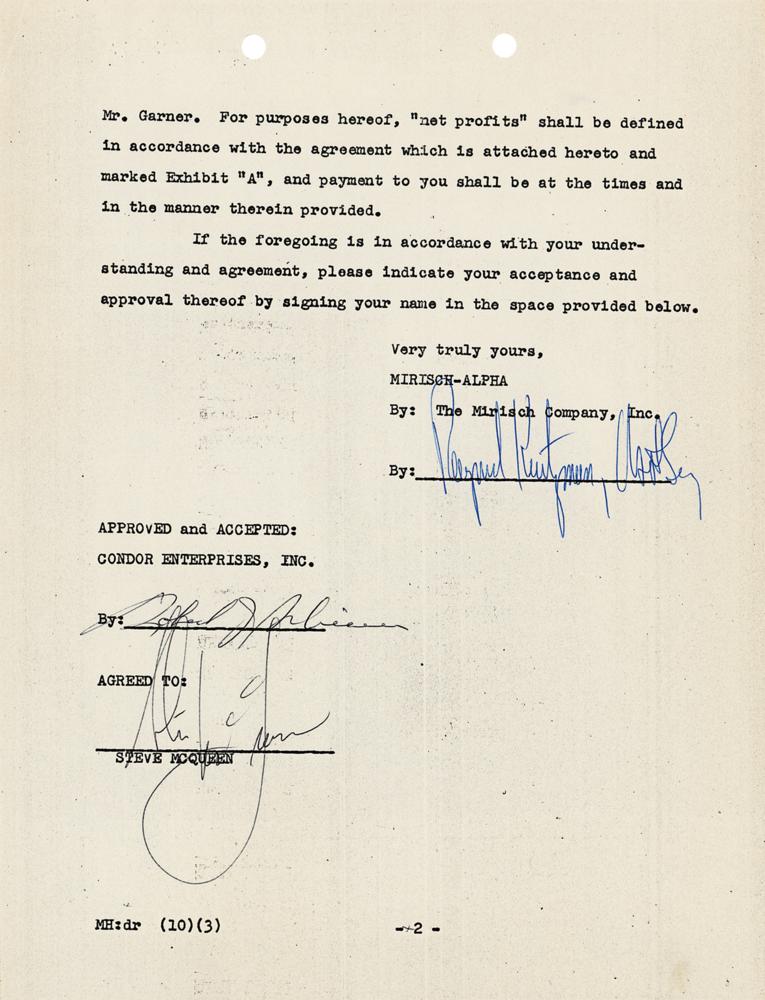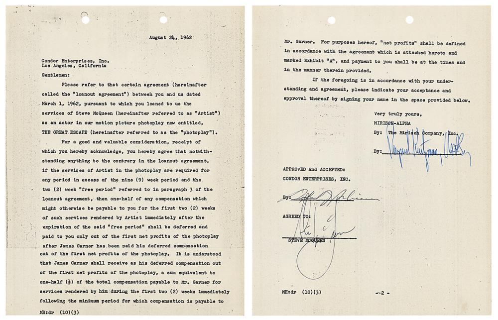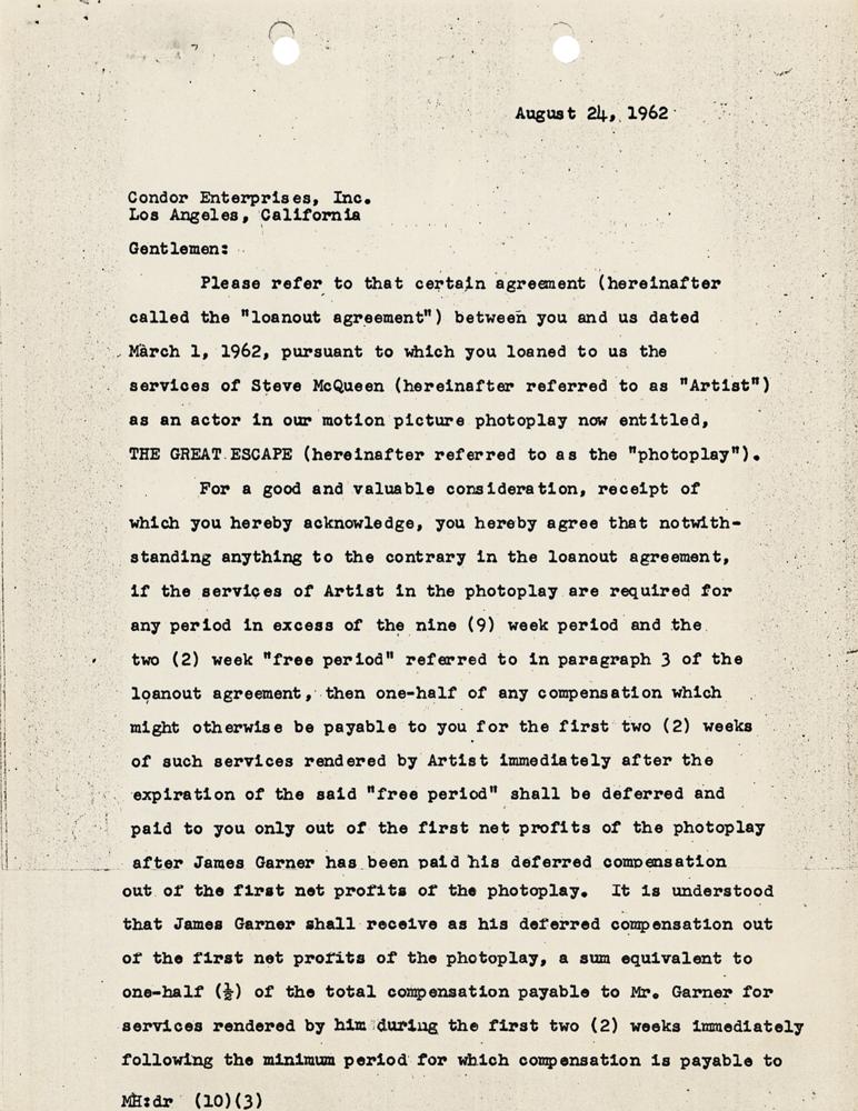 DS, two pages, 8.5 x 11, August 24, 1962. An amendment to a contract between Mirisch-Alpha and Condor Enterprises related to a 'loanout agreement' for "the services of Steve McQueen?as an actor in our motion picture photoplay now entitled, THE GREAT ESCAPE," which clarifies that if the loan-out exceeds its duration that further compensation "shall be deferred and paid to you only out of the first net profits of the photoplay after James Garner has been paid his deferred compensation." Signed at the conclusion in black ballpoint by McQueen. In fine condition. Accompanied by a full letter of authenticity from JSA.