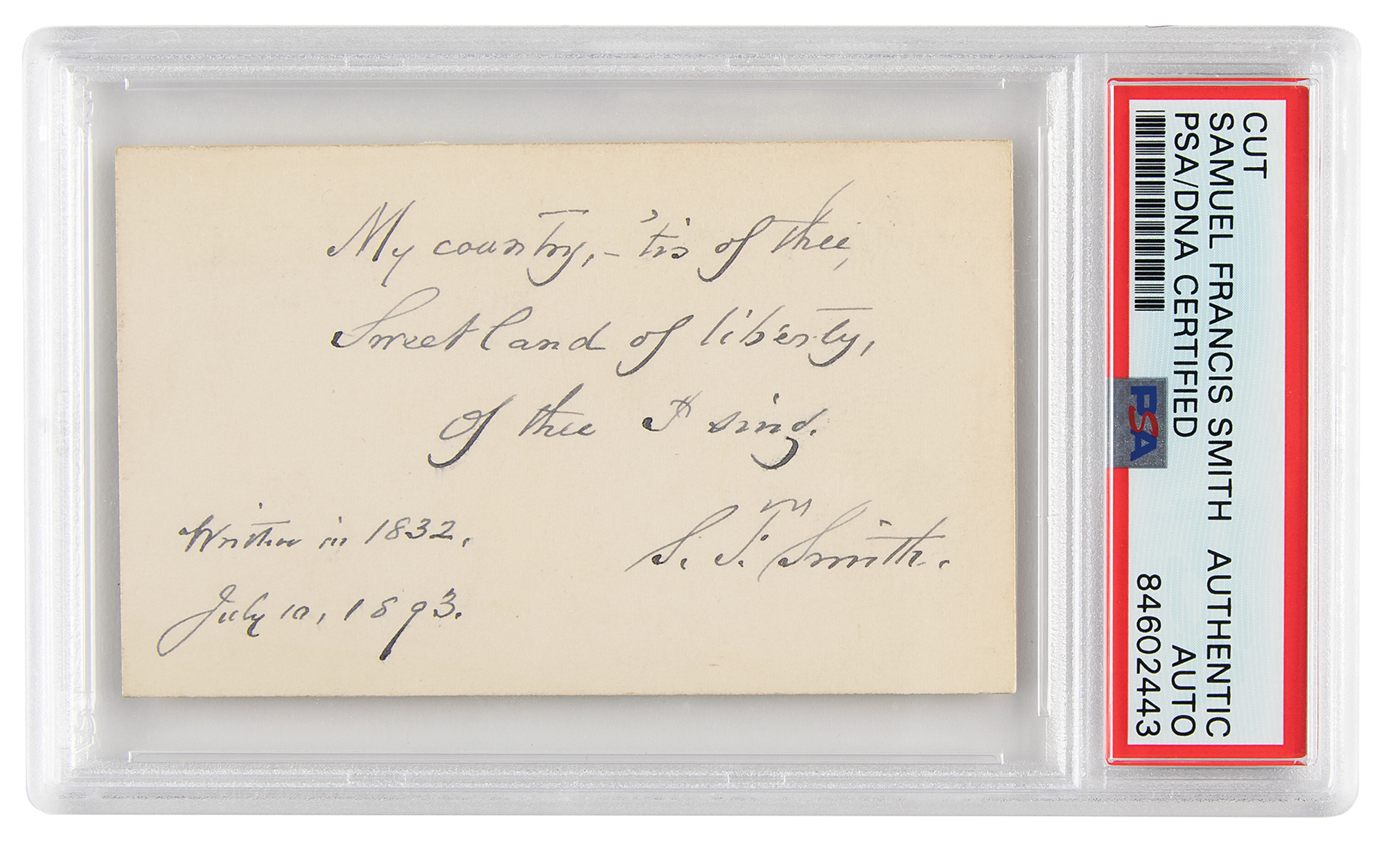 AQS on an off-white 3.5 x 2 card, signed at the conclusion in ink, “S. F. Smith, Written in 1832, July 10, 1893.” Smith neatly pens the iconic opening lines of his classic ‘America,’ in full: “My country, - 'tis of thee, / Sweet land of liberty, / Of thee I sing.” In fine condition. Encapsulated in a PSA/DNA authentication holder. Accompanied by a full letter of authenticity from JSA.