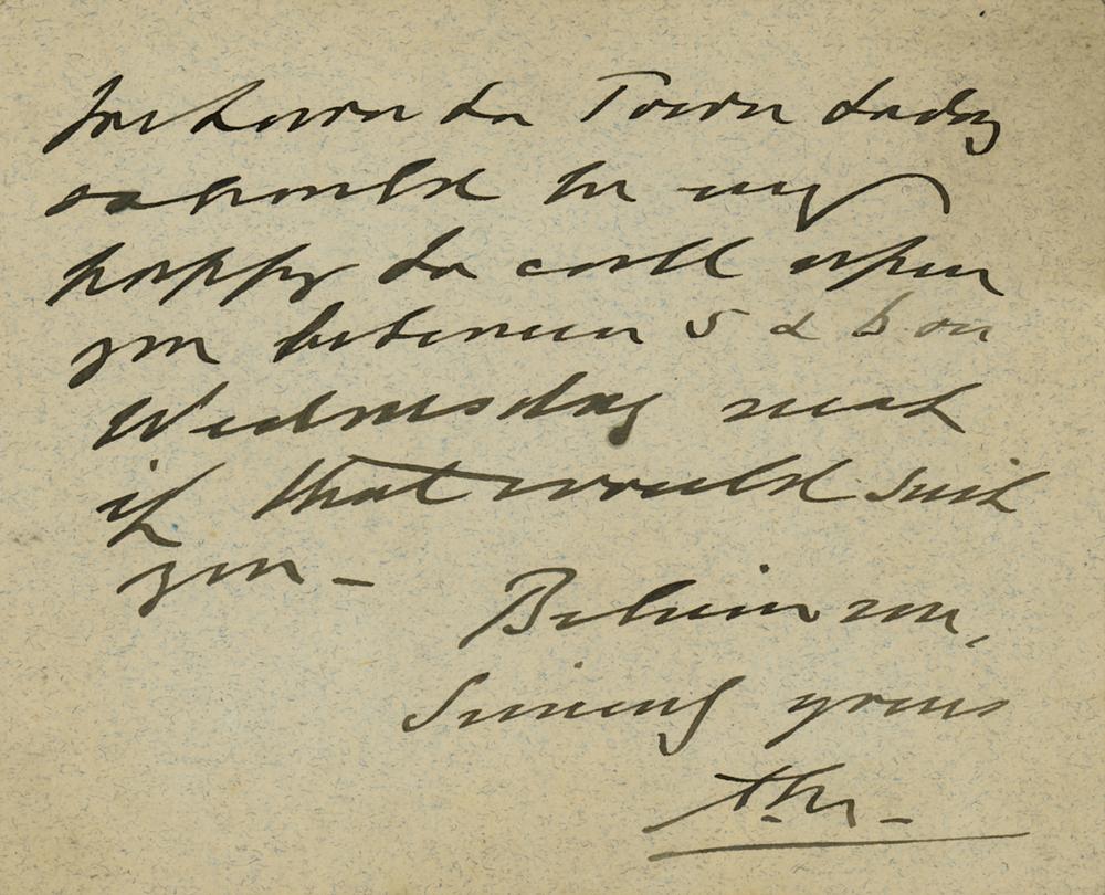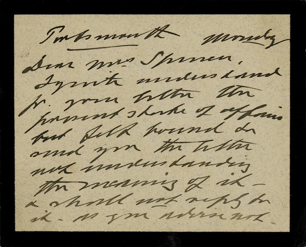 ALS signed “A. E.,” both sides of a black-bordered 5 x 4 stationery card, postmarked April 1892. Handwritten letter to Mrs. Spencer, notifying her that he has received her letter regarding "the present state of officers but felt bound to send you the letter not understanding the meaning of it—& should not reply to it—as you advise not." In fine condition. Accompanied by the original hand-addressed mailing envelope.