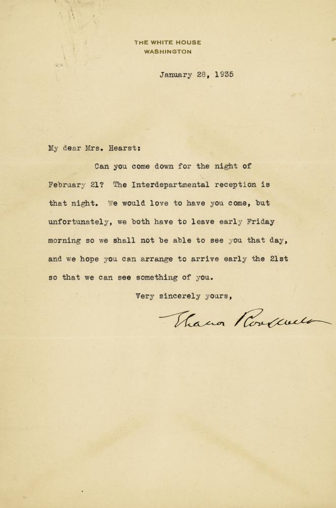 TLS as first lady, one page, 6 x 9.25, White House letterhead, January 28, 1935. Letter to Millicent Hearst, the wife of media tycoon William Randolph Hearst, in full: "Can you come down for the night of February 21? The Interdepartmental reception is that night. We would love to have you come, but unfortunately, we both have to leave early Friday morning so we shall not be able to see you that day, and we hope you can arrange to arrive early the 21st so that we can see something of you." In fine condition, with paperclip impressions to the upper left corner, and light seal-related toning to the bottom blank area. Accompanied by the original White House mailing envelope.