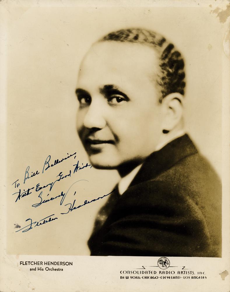 American pianist, bandleader, arranger, and composer (1897-1952) who was important in the development of big band jazz and swing music. He was one of the most prolific black musical arrangers and, along with Duke Ellington, is considered one of the most influential arrangers and bandleaders in jazz history. Scarce vintage glossy 8 x 10 Consolidated Radio Artists publicity photo for Fletcher Henderson and His Orchestra, which shows the bandleader in a side-glancing bust-length pose, signed and inscribed in fountain pen, "To Bill Baldwin, With every good wish, Sincerely, Fletcher Henderson.” In very good to fine condition, with scattered light creasing, and areas of surface loss to the upper and lower right corners.