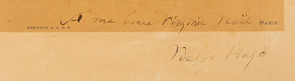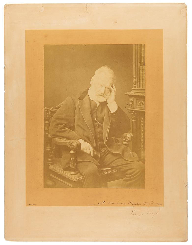 Massive vintage sepia 10.25 x 14.5 photo of Victor Hugo by the Walery Studio of Paris, affixed to the original 18.5 x 24 studio mount, which is signed and inscribed in black ink, "A ma bonne Virginie Noel, Victor Hugo.” In very good to fine condition, with light toning, scattered foxing, and dings and tears to the edges, which could be matted out if desired. An impressive oversized portrait of the French scribe—given how the majority of Hugo signed photographs are reserved to the carte-de-visite format, this large example looms as a most unusual and desirable piece.