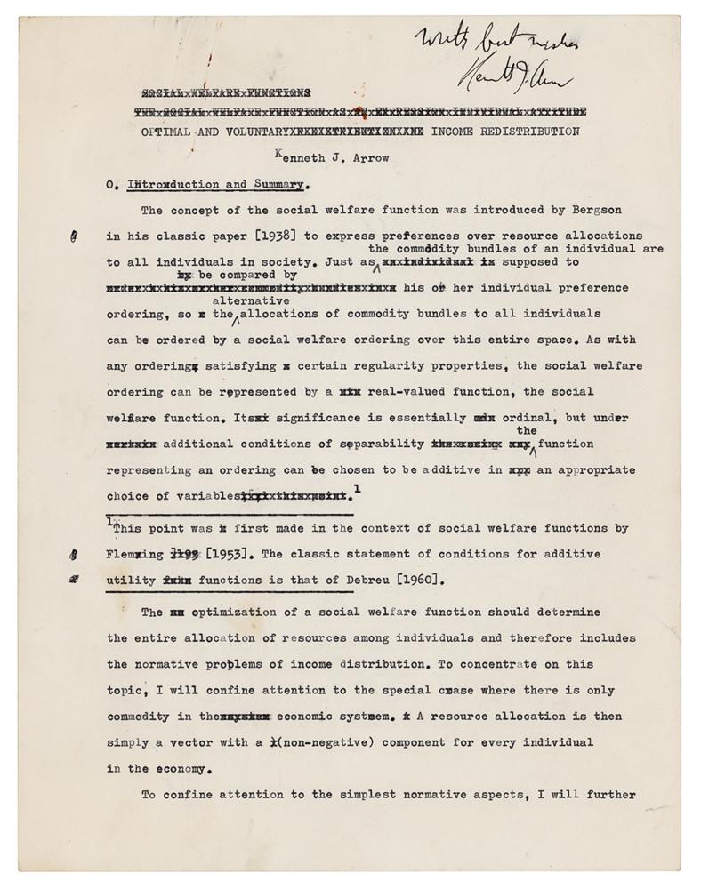 Influential American economist, writer, and political theorist (1921-2017) who received the Nobel Memorial Prize in Economic Sciences in 1972. Typed manuscript of his article "Optimal and Voluntary Income Distribution," signed at the head, "With best wishes, Kenneth J. Arrow," 8.5 x 11, 30 pages, published in the 1981 work Economic Welfare and the Economics of Soviet Socialism: Essays in honor of Abram Bergson. In part: "The concept of the social welfare function was introduced by Bergson in his classic paper (1938) to express preferences over resource allocations to all individuals in society. Just as the commodity bundles of an individual are supposed to be compared by his or her individual preference ordering, so the alternative allocations of commodity bundles to all individuals can be ordered by a social welfare ordering over this entire space." The draft of the essay boasts several typed and handwritten corrections throughout. In fine condition.