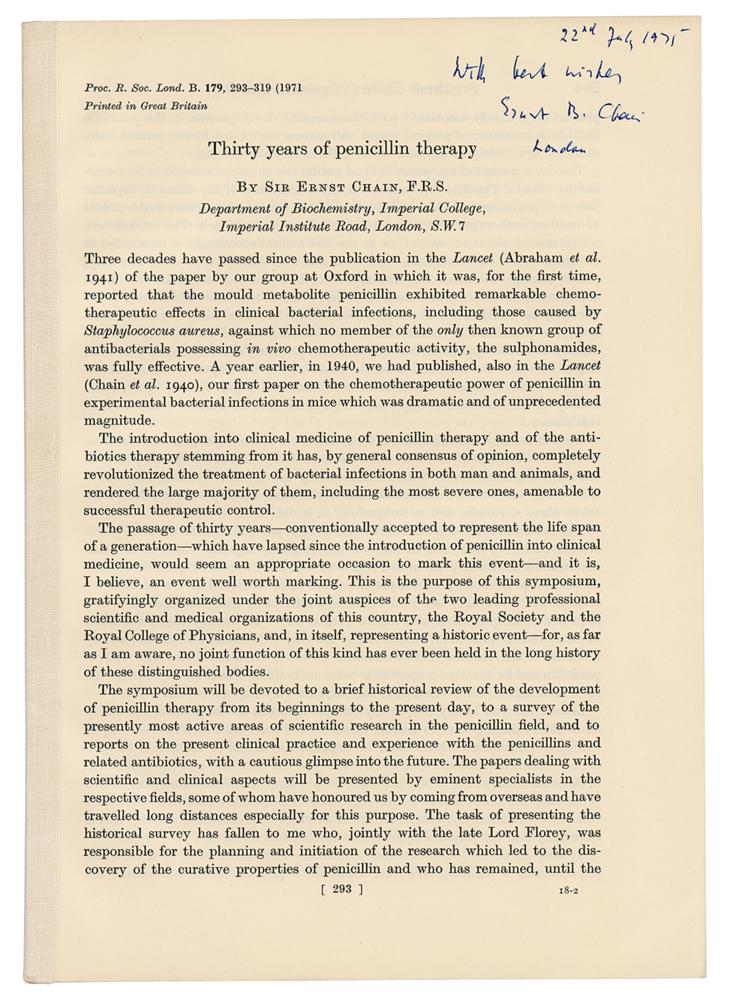 German-British biochemist (1906-1979) best known for being a co-recipient of the Nobel Prize in Physiology or Medicine for his work on penicillin. Printed article entitled "Thirty Years of Penicillin Therapy," dated and signed at the head in blue ballpoint, "22nd July 1975, With best wishes, Ernst B. Chain, London," 26 pages, 6.75 x 9.5, in small part: "The introduction into clinical medicine of penicillin therapy and of the antibiotics therapy stemming from it has, by general consensus of opinion, completely revolutionized the treatment of bacterial infections in both man and animals, and rendered the large majority of them, including the most severe ones, amenable to successful therapeutic control." In fine condition.