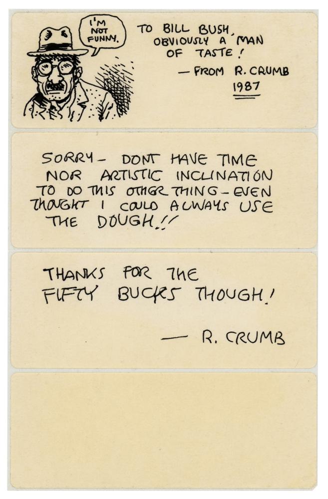 Original ink sketch of a front-facing self-portrait by Robert Crumb, which shows the artist wearing a hat and looking a bit haggard, with speech bubble to right adding, "I'm not funny." The sketch is accomplished in black ink on the uppermost off-white label on a four-label 4 x 6.25 sheet, which is also signed and inscribed, "To Bill Bush, obviously a man of taste!—from R. Crumb, 1987." The second and third labels contain an ANS signed "R. Crumb," in full: "Sorry—Don't have time nor artistic inclination to do this other thing—even though I could always use the dough!! Thanks for the fifty bucks though!" In very fine condition.