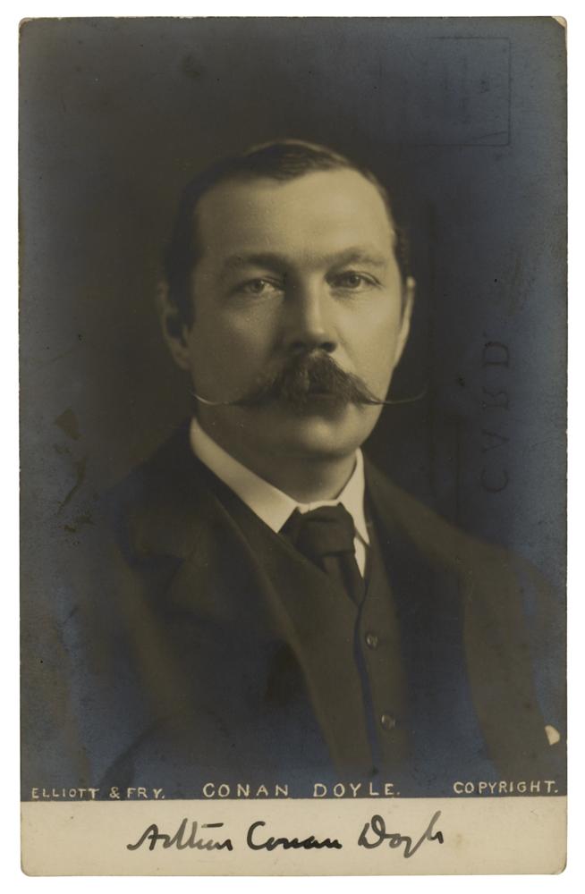 Vintage matte-finish 3.5 x 5.5 postcard photo of the author in a handsome head-and-shoulders pose by Elliott & Fry, signed in the lower border in fountain pen, "Arthur Conan Doyle." In fine condition, with irregular light silvering to the perimeter of the image. An outstanding autographed portrait of the Sherlock Holmes creator.